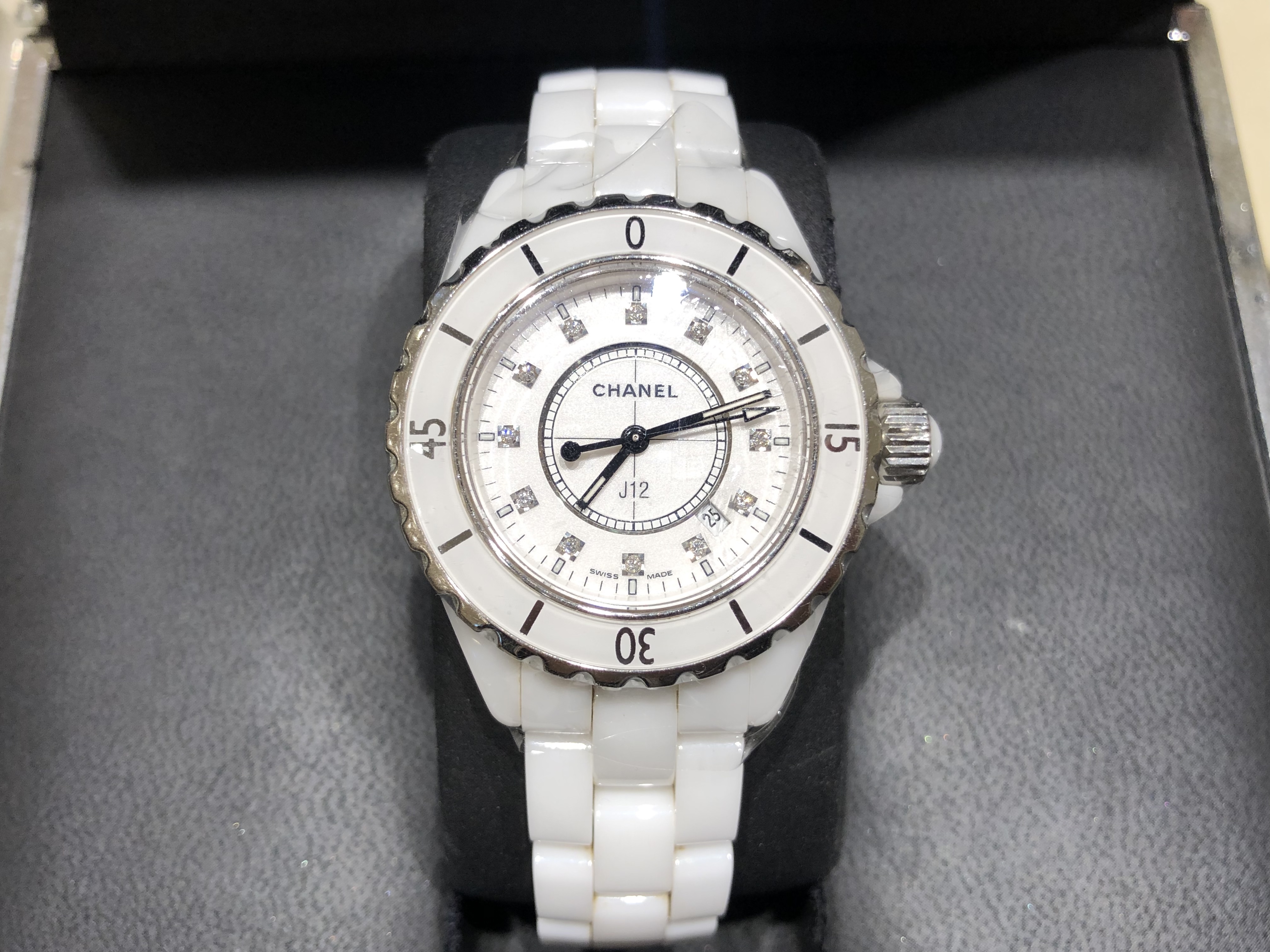 シャネルの人気フラッグシップウォッチで「J12」。異素材で傷がつきにくく独特な光沢感をもつセラミックをうまくデザインに融合させた1本。12Pダイヤモンド。