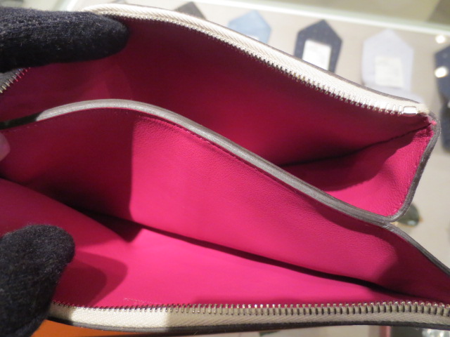 エルメスのシンプルなポーチです。外はシンプルですが、中は鮮やかなピンクパープルで可愛らしいデザインです♪