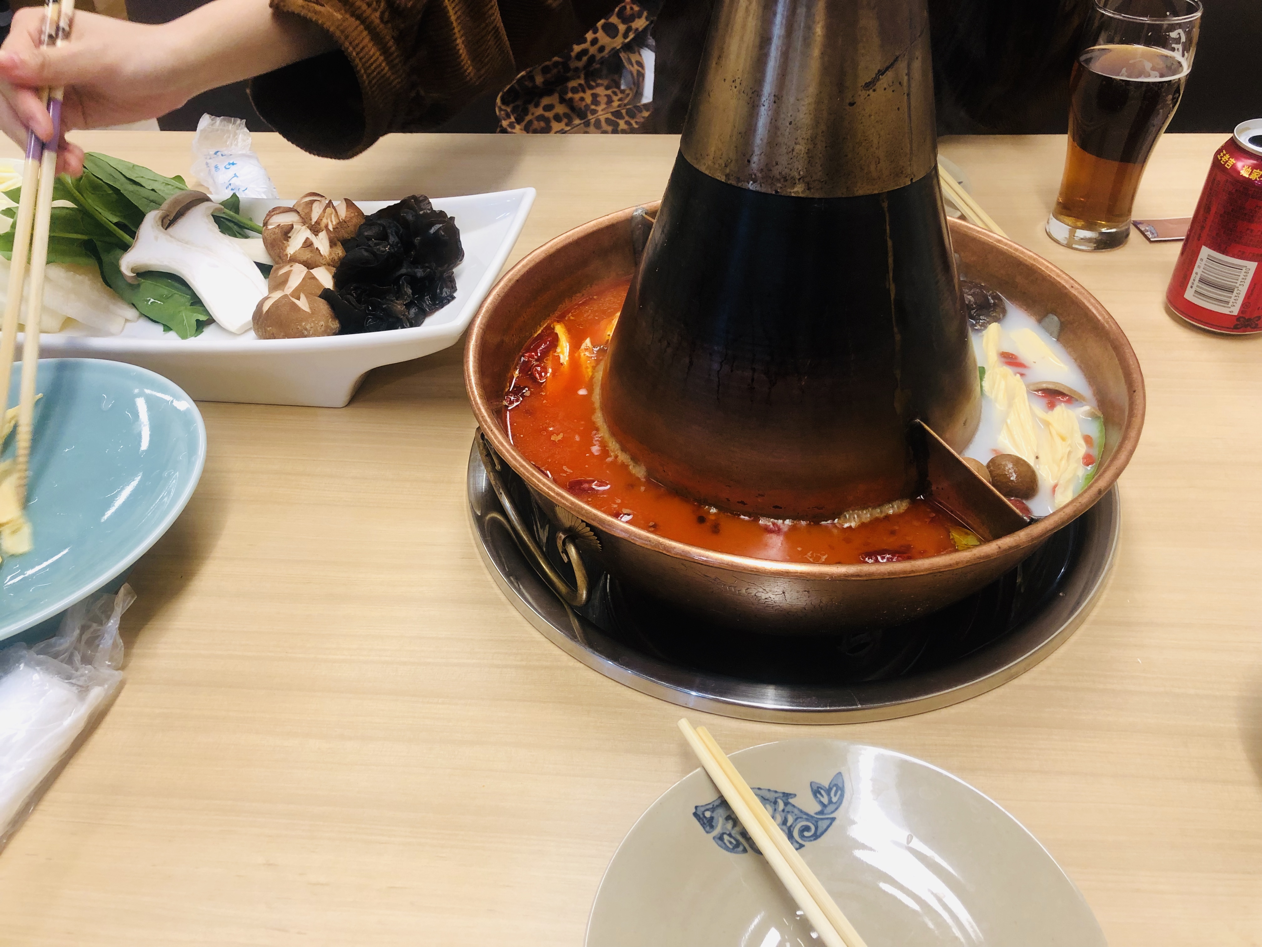 これです!「銅鍋涮肉」(あかなべしゃぶしゃぶ)でございます。今回は鴛鴦火鍋(えんおうひなべ)を選びました。付けタレはゴマベースで、口当たりは滑らかで濃厚。ラム肉と牛肉をしゃぶしゃぶするのはめちゃくちゃ美味しかったです!