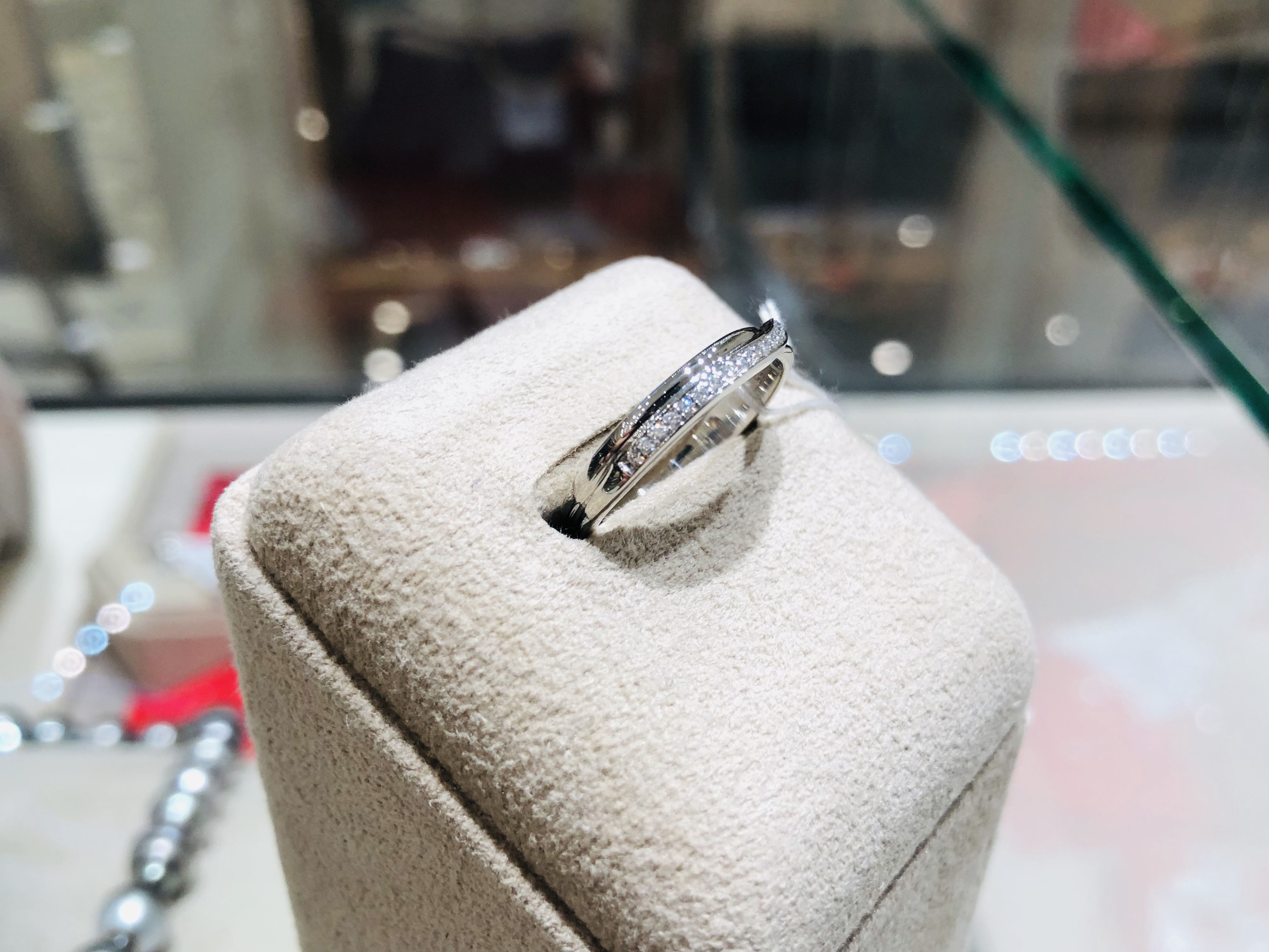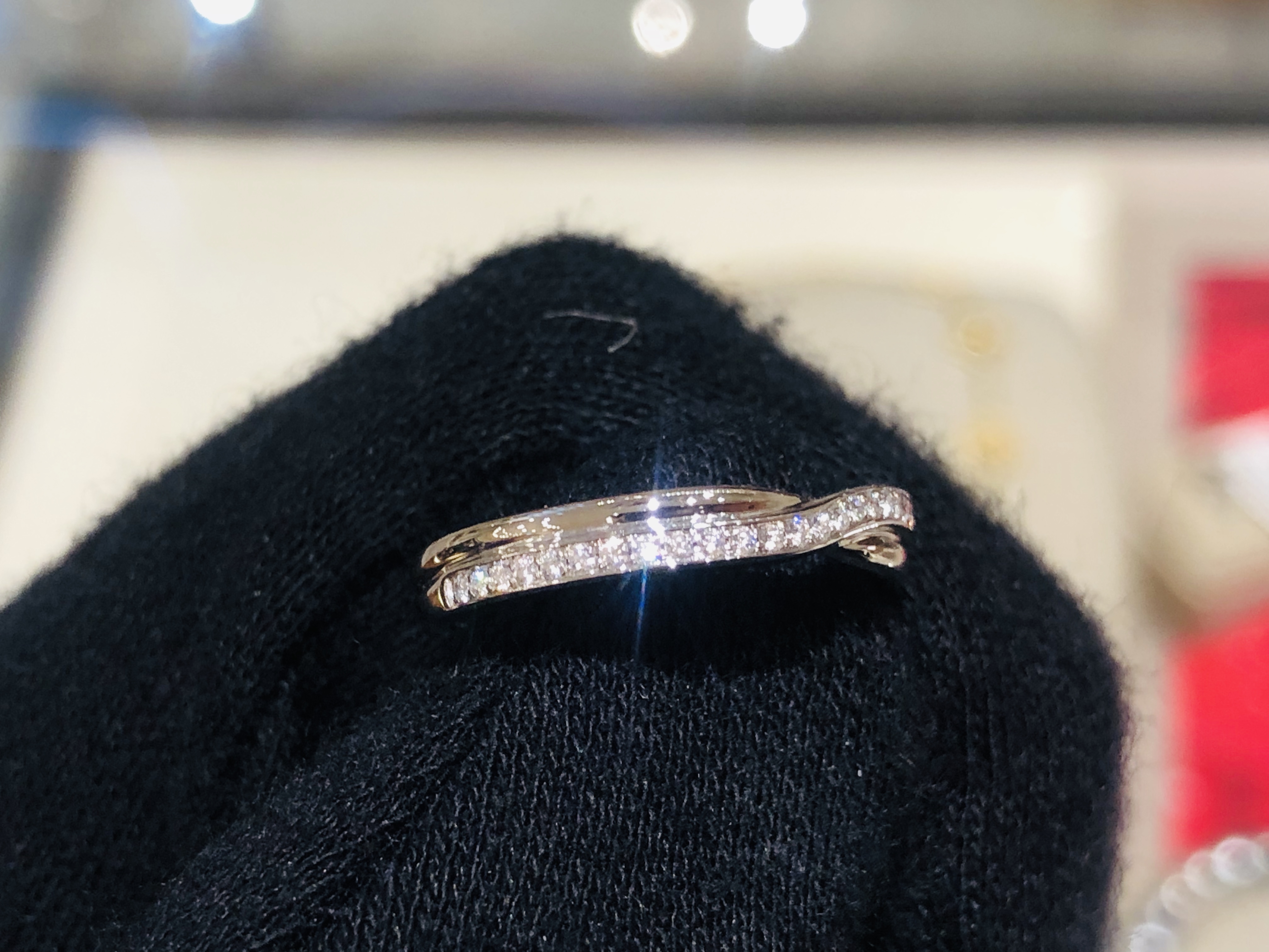 プラチナ製。立爪リングとの調和を考えられてデザインされたダイヤリングです。1本で着用しても豪華な造りになっています。。