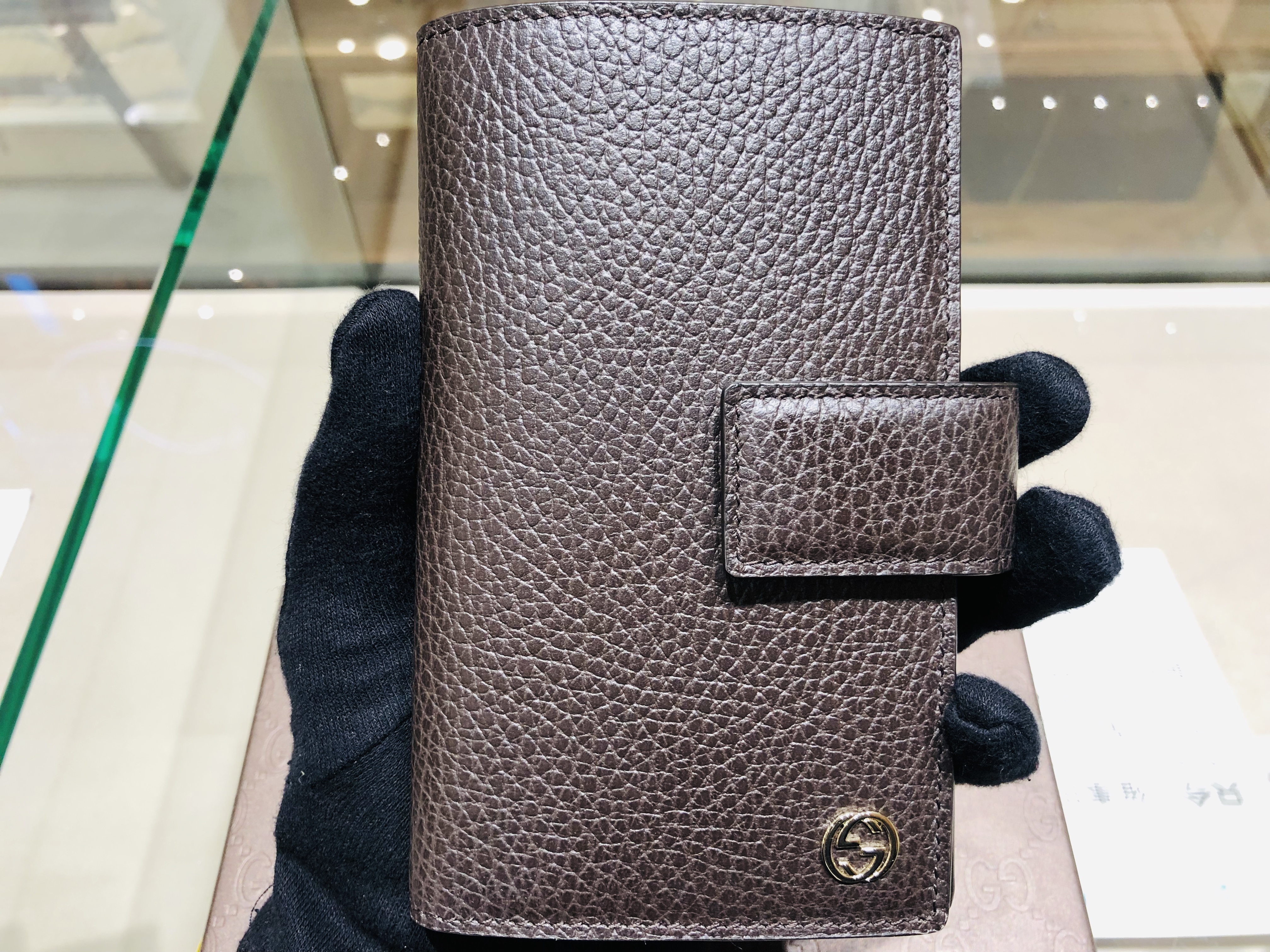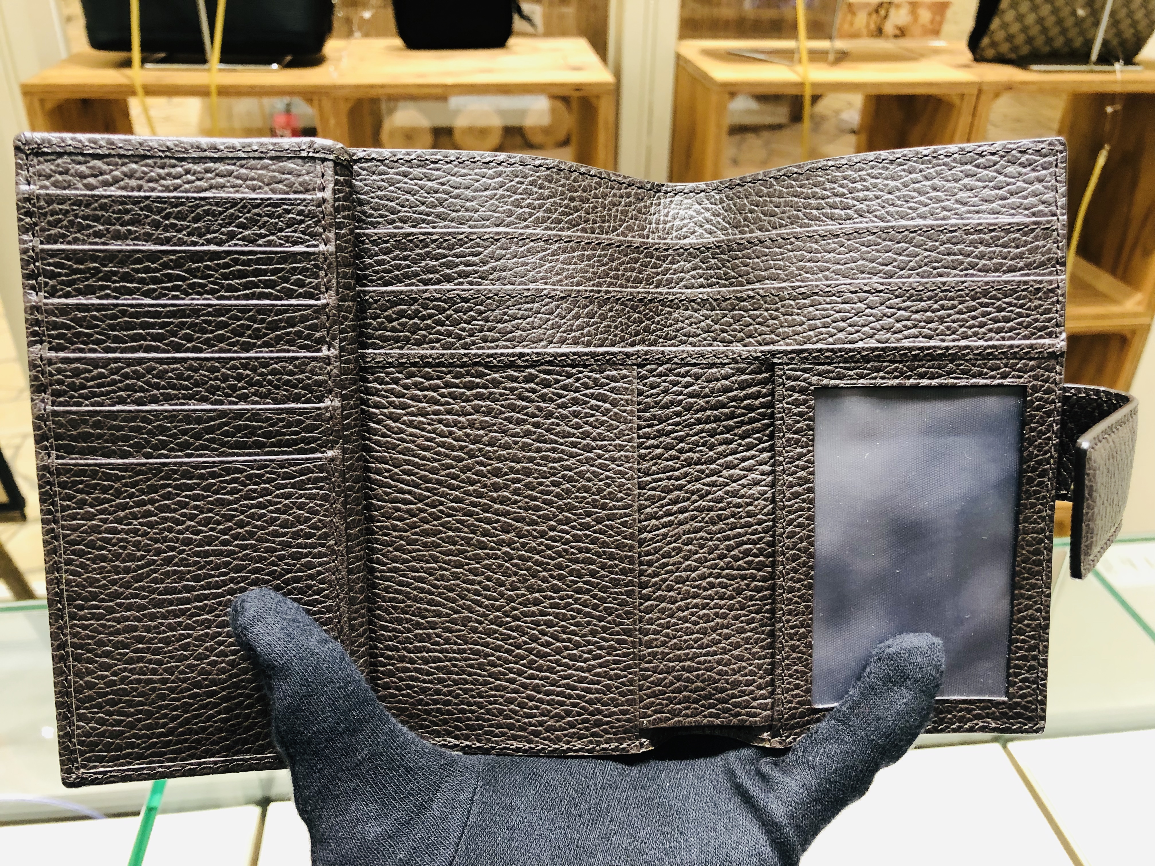 まず1点目、シンプルでスリムでコンパクトなタイプなので、スーツの内ポケットやズボンのポケットにすっきり収まりまるグッチの3つ折り札入れでございます。