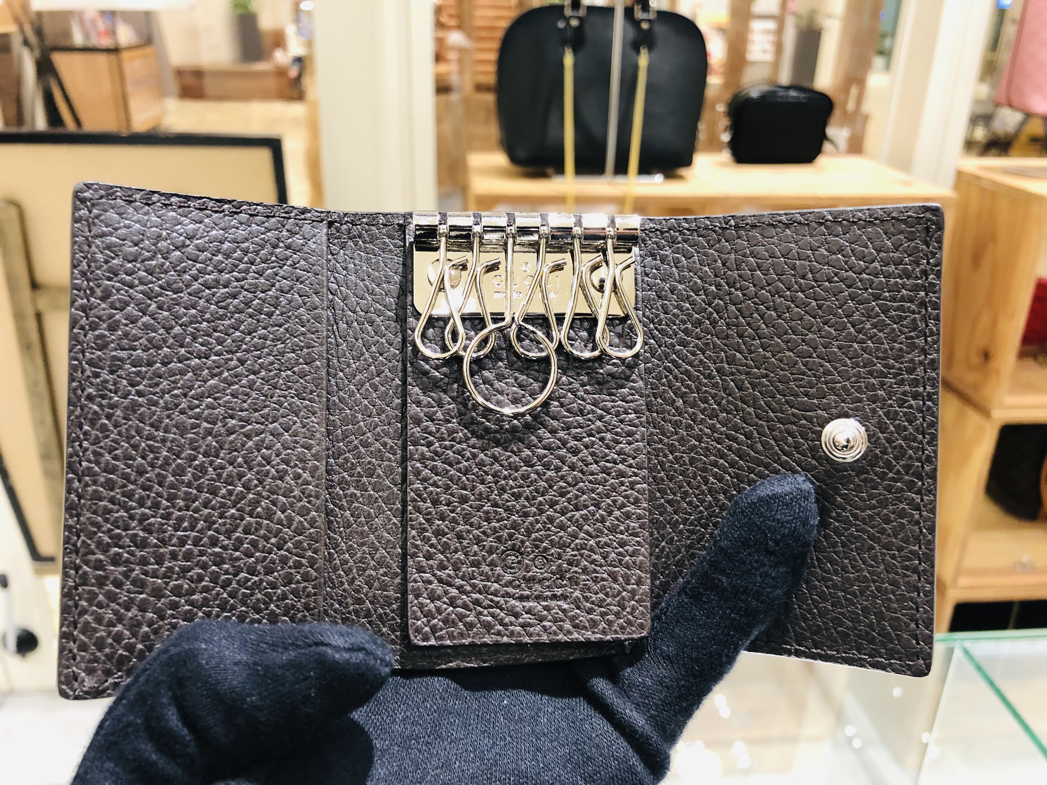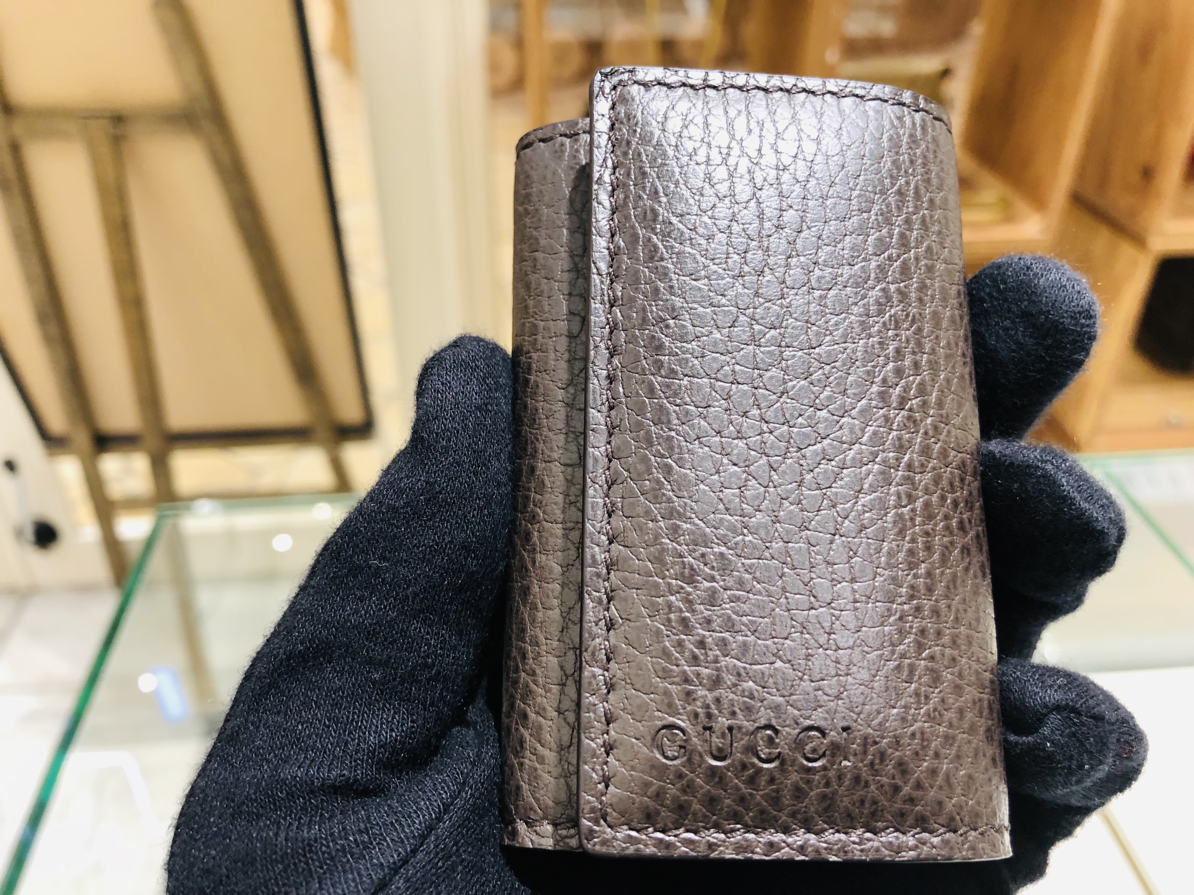 二点目、型押しレザーの6連キーケースとなります。インターロッキングG金具がポイントです。