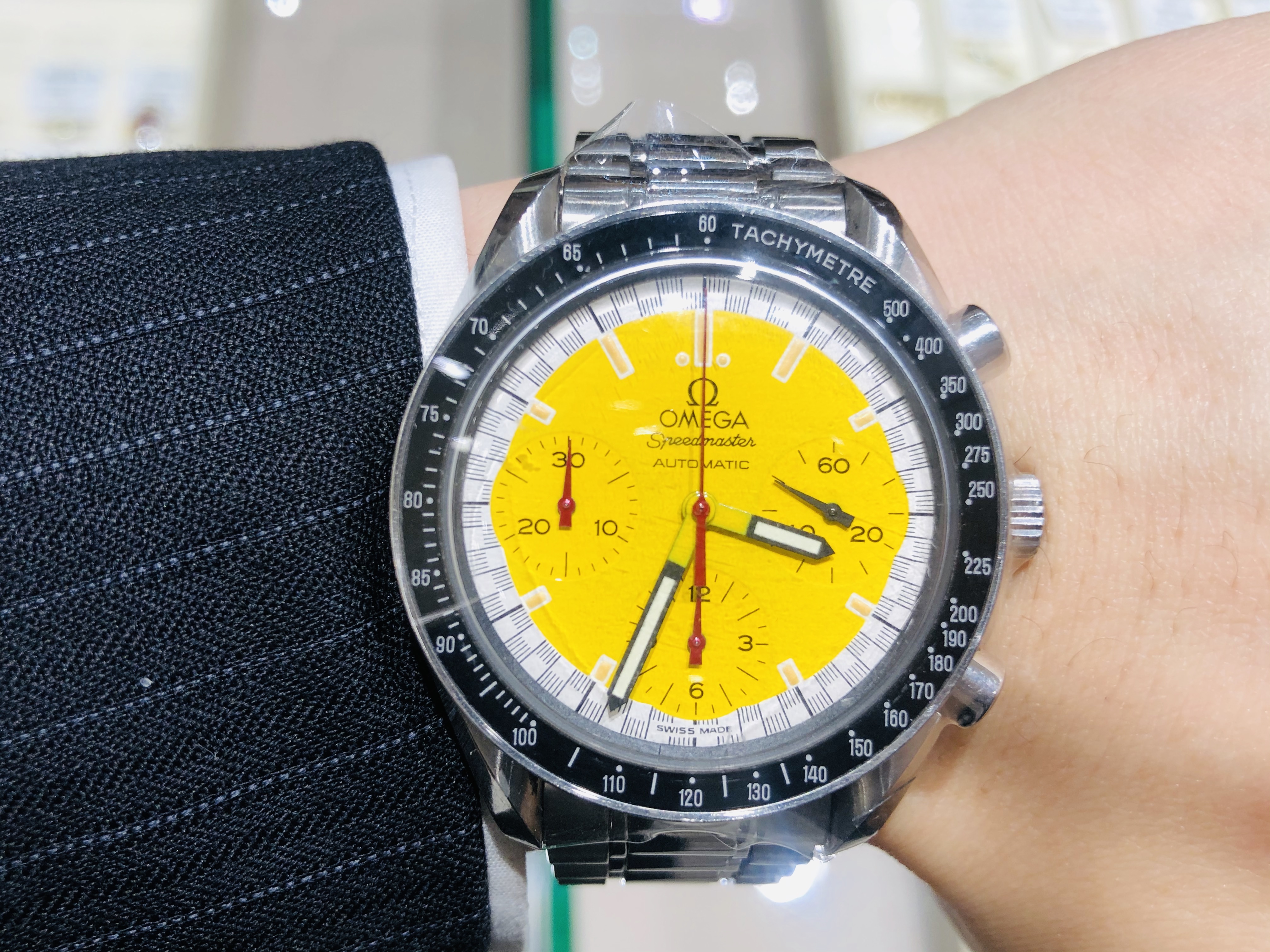 1998年のワールドチャンピオンを記念したミハエル・シューマッハの限定モデルです。イエローのダイヤルはその後の数あるスピードマスターのバリエーションでもほとんど見ません。希少な一本です。