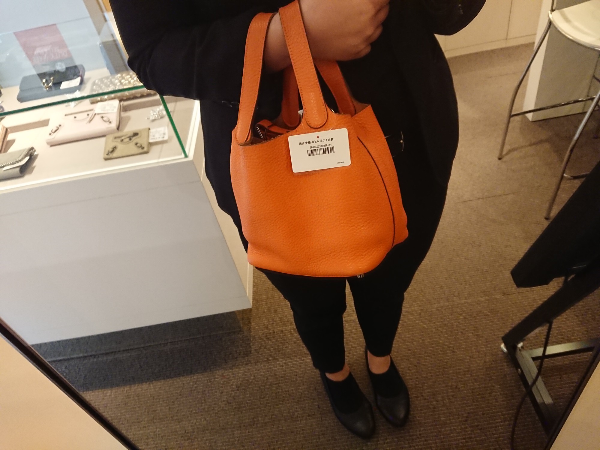 □O刻印(2011年製)。幅広い年齢層に人気のピコタンロック。持ちやすい大きさに加え、見た目以上に荷物が入ります。エルメスらしいオレンジカラーが可愛らしい商品です。