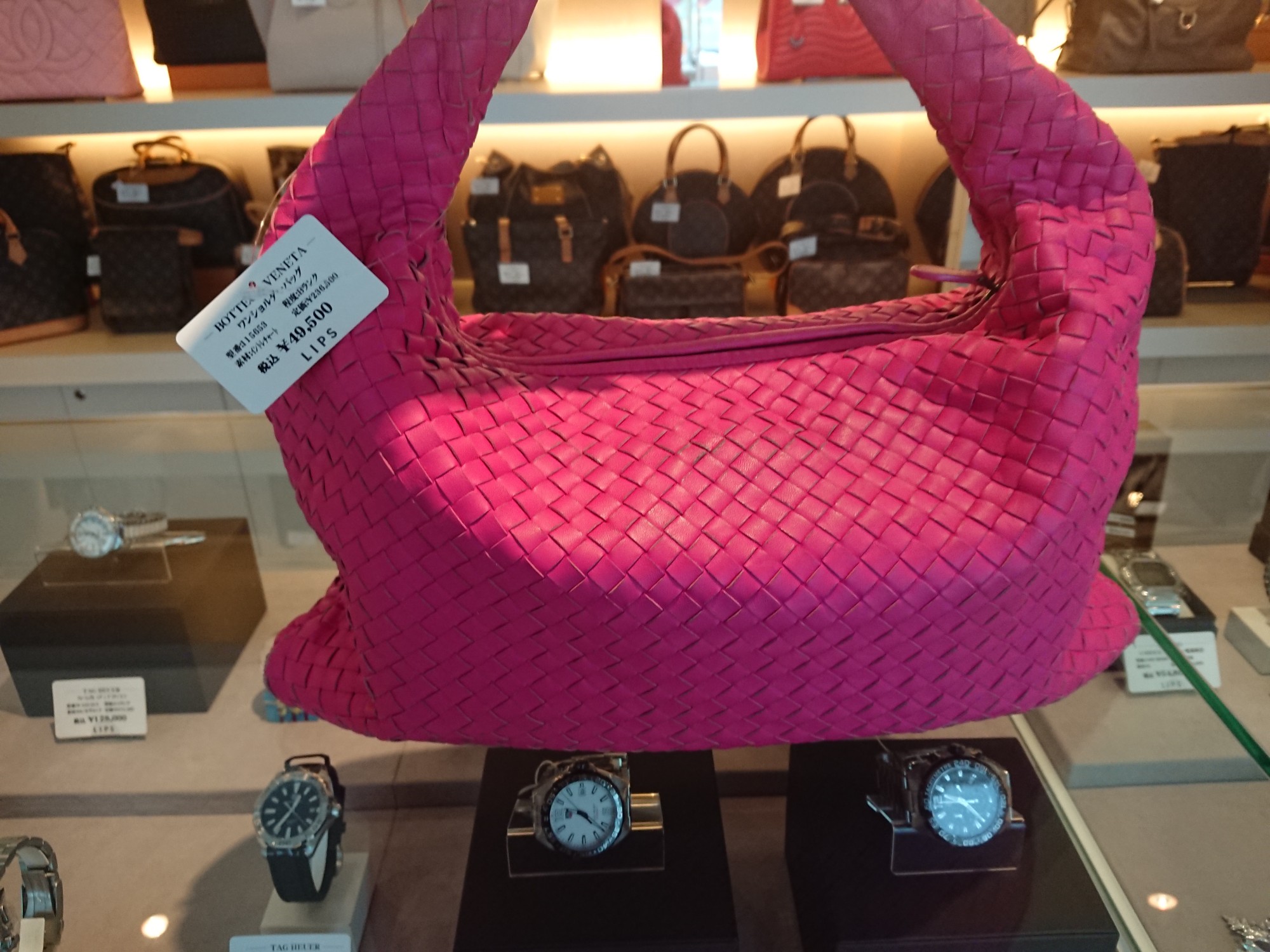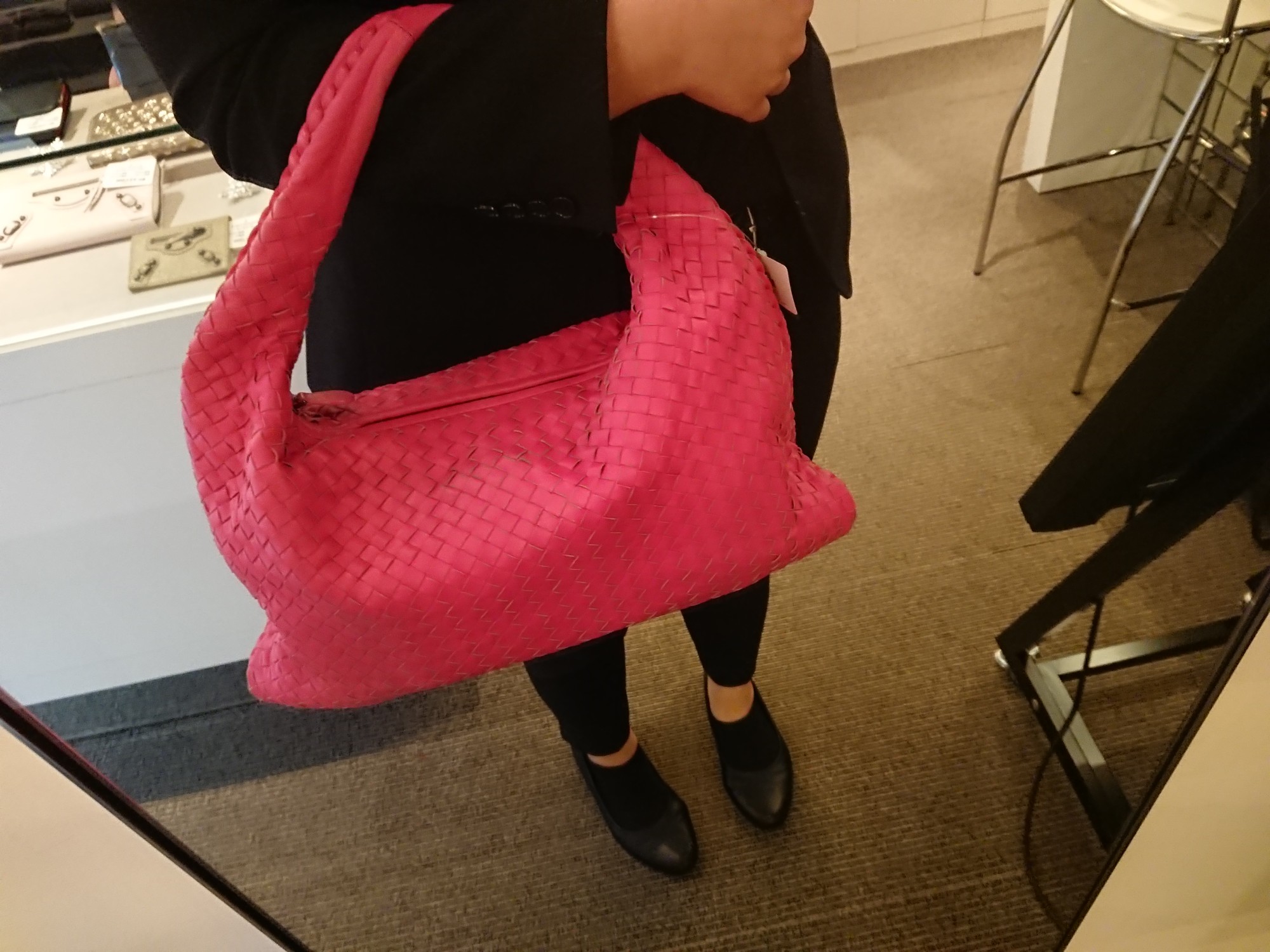ボッテガヴェネタの代名詞とも言えるイントレチャートが施されたバッグです。大人な高級素材に可愛いピンクが素敵です。