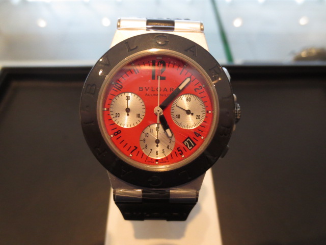 ブルガリでは珍しい赤い文字の時計です。なかなか探しても出てこない個性あふれる文字盤だと思います。
