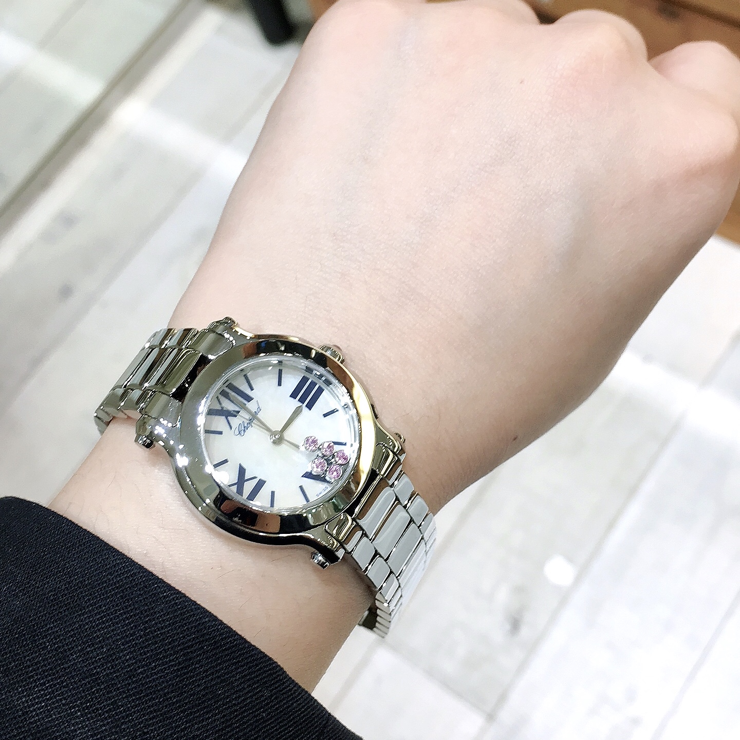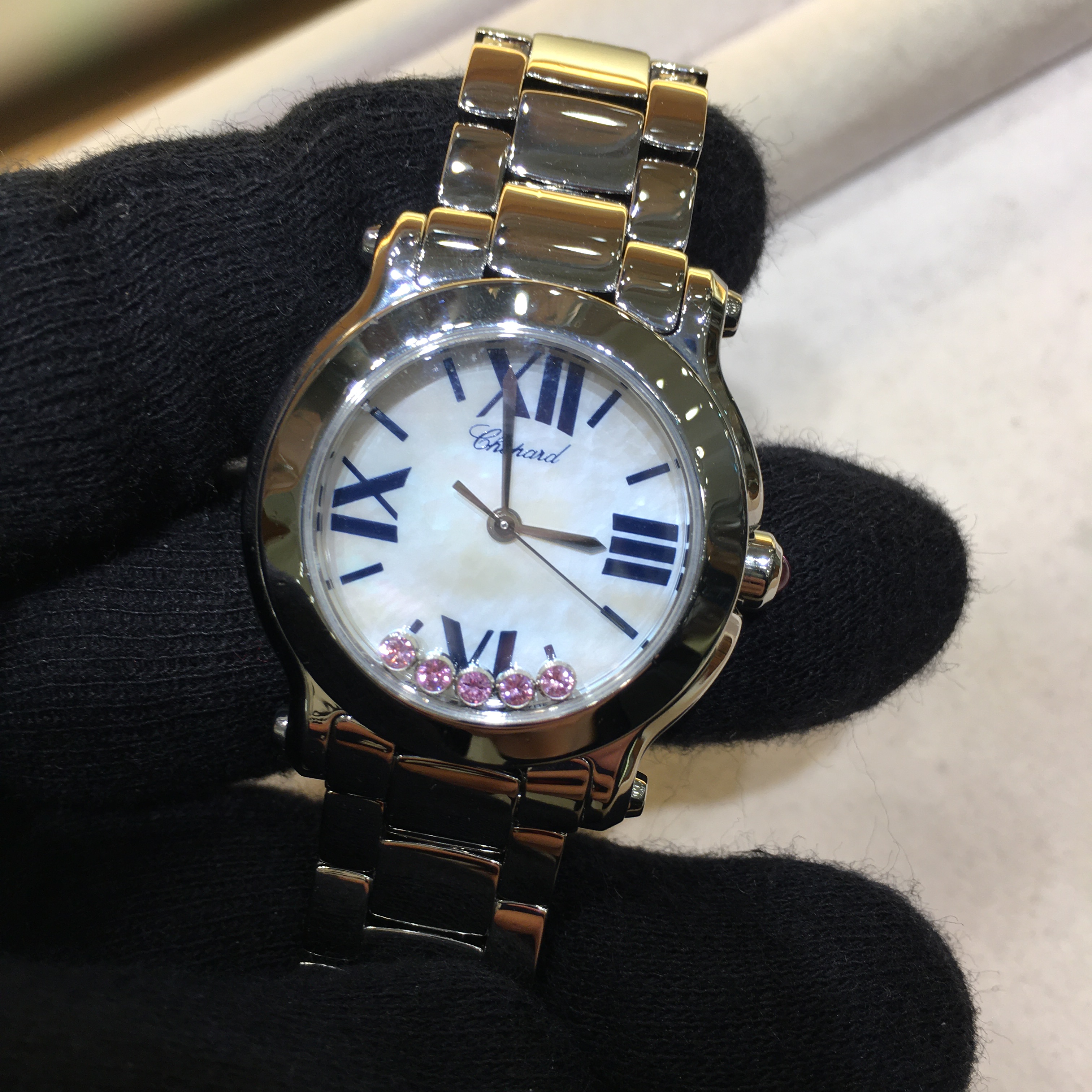 5粒のピンクサファイアが文字盤の上をクルクルと動く可愛らしいモデルです。