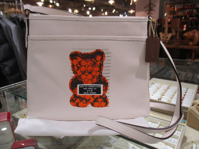 ~USED品。コンパクトなショルダーバック。オレンジ味のグミベアのようなポップな柄が印象的。両手が空くのでお買い物や旅行のお供にも最適です。~