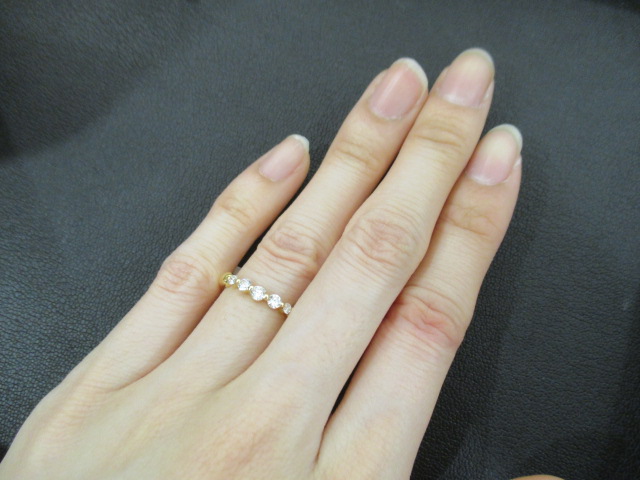 ~USED品。イエローゴールド製。ゆるいカーブが女性らしさを演出。ダイヤが一列に並んだシンプルなデザインで、どんなファッションにも合わせやすくなっています。~