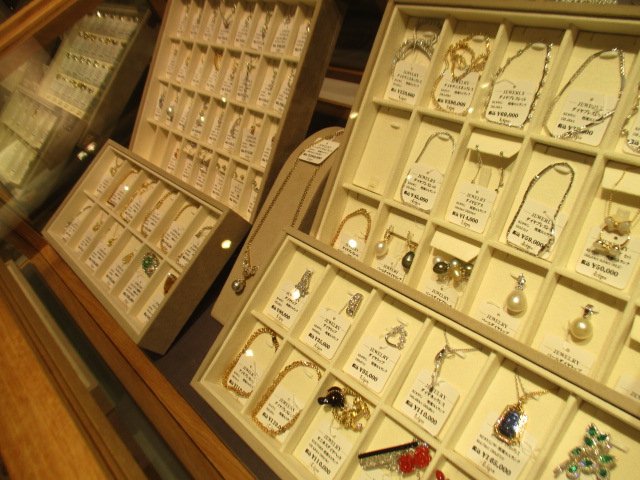 ジュエリーは店内の真ん中にあるショーケースに展示しております。