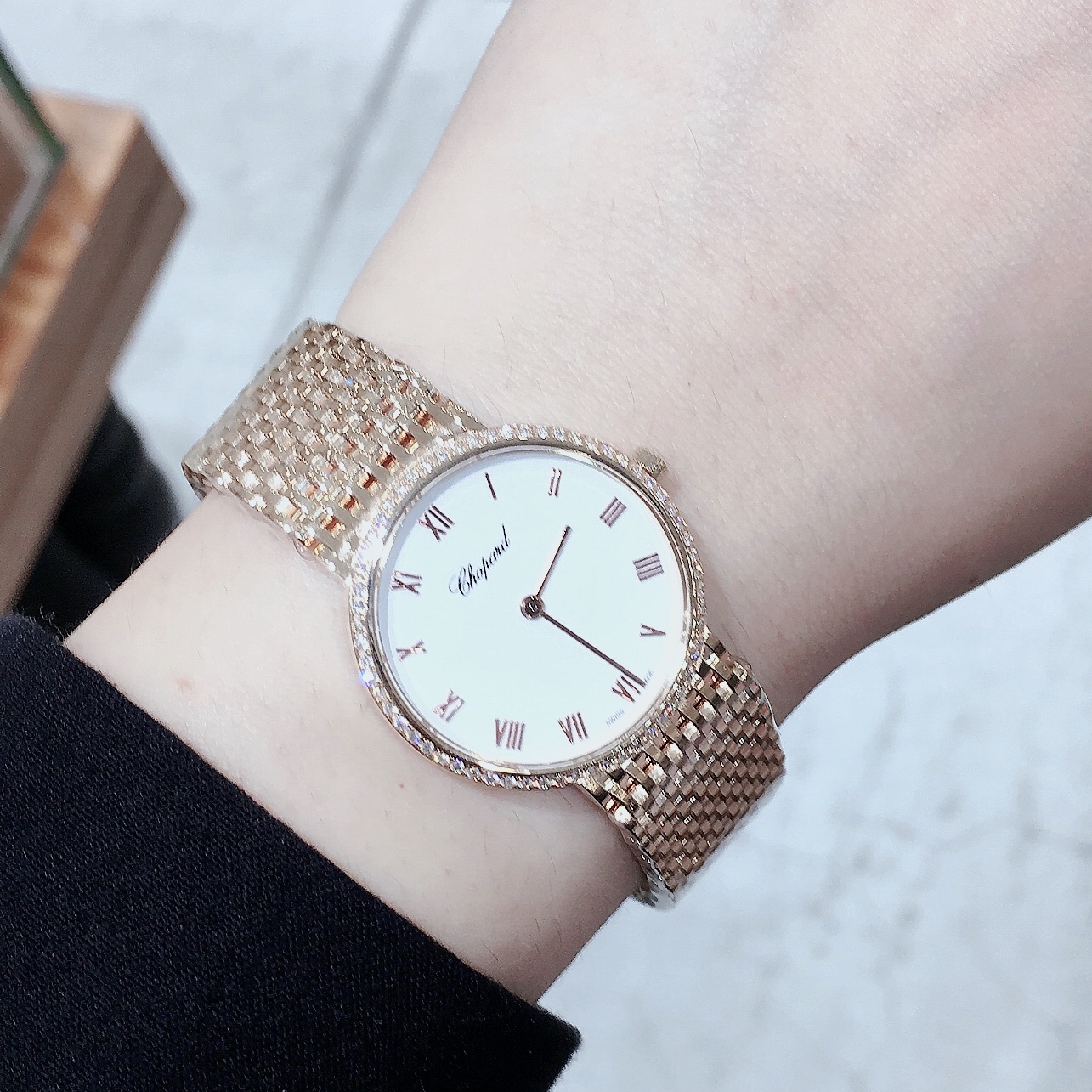 ピンクゴールド素材が採用され、クラシカルなデザインながらシンプルでベゼルのダイヤが豪華さを上品に演出しています。