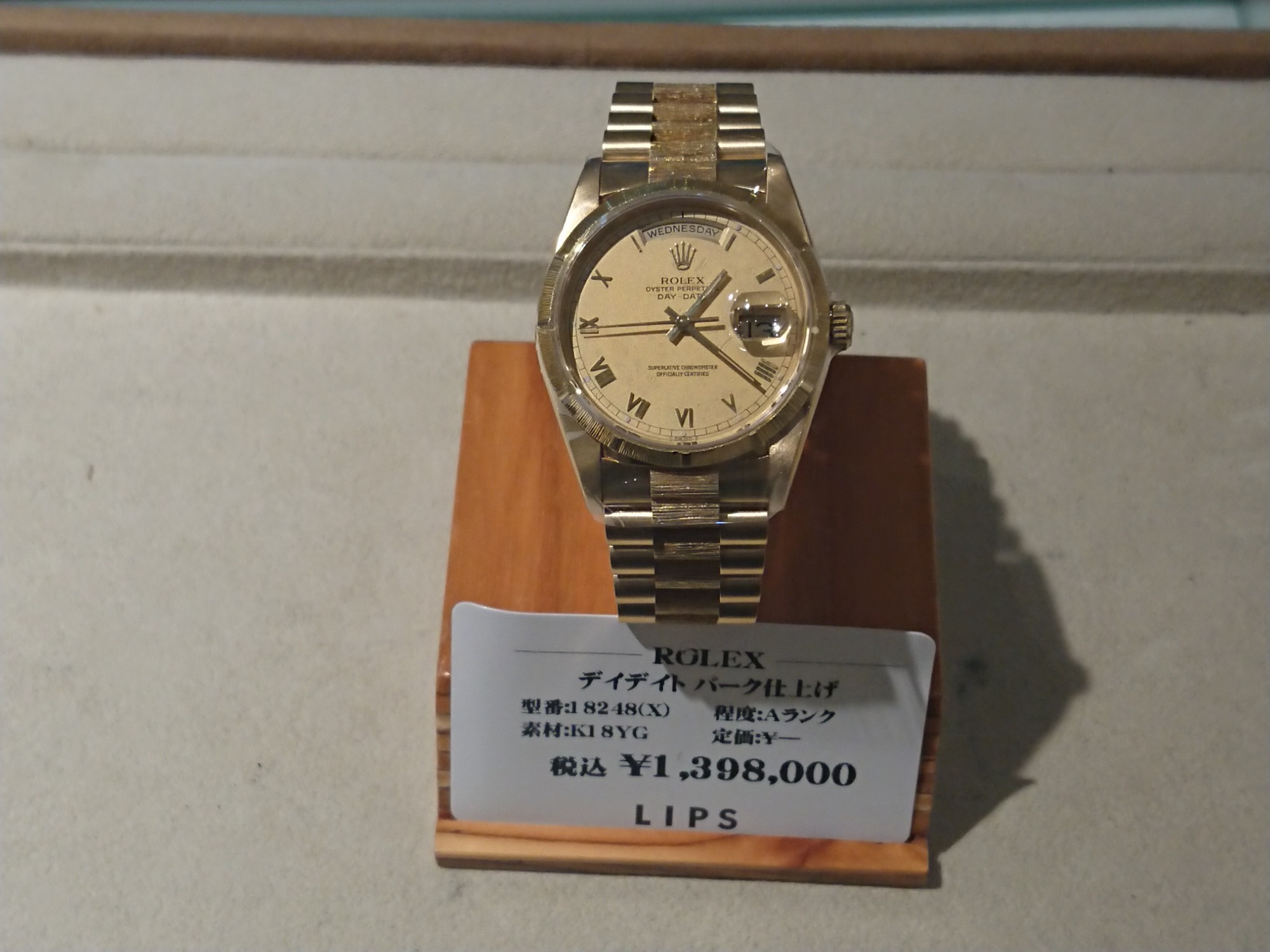 ロレックスのドレスウォッチの最高峰「デイデイト」。イエローゴールドを贅沢に使用した高級感溢れるステータスウォッチです。こちらは貴重なバーク仕上げとなっております。