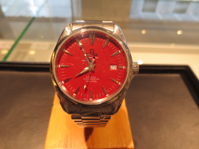 都内の人気ストアー・マルイマルイさん限定モデルです。情熱的な赤がカッコいいデザインですね。シーマスターでは赤い文字盤はすごく珍しいですので、レアなモデルをお探しの方にピッタリです。