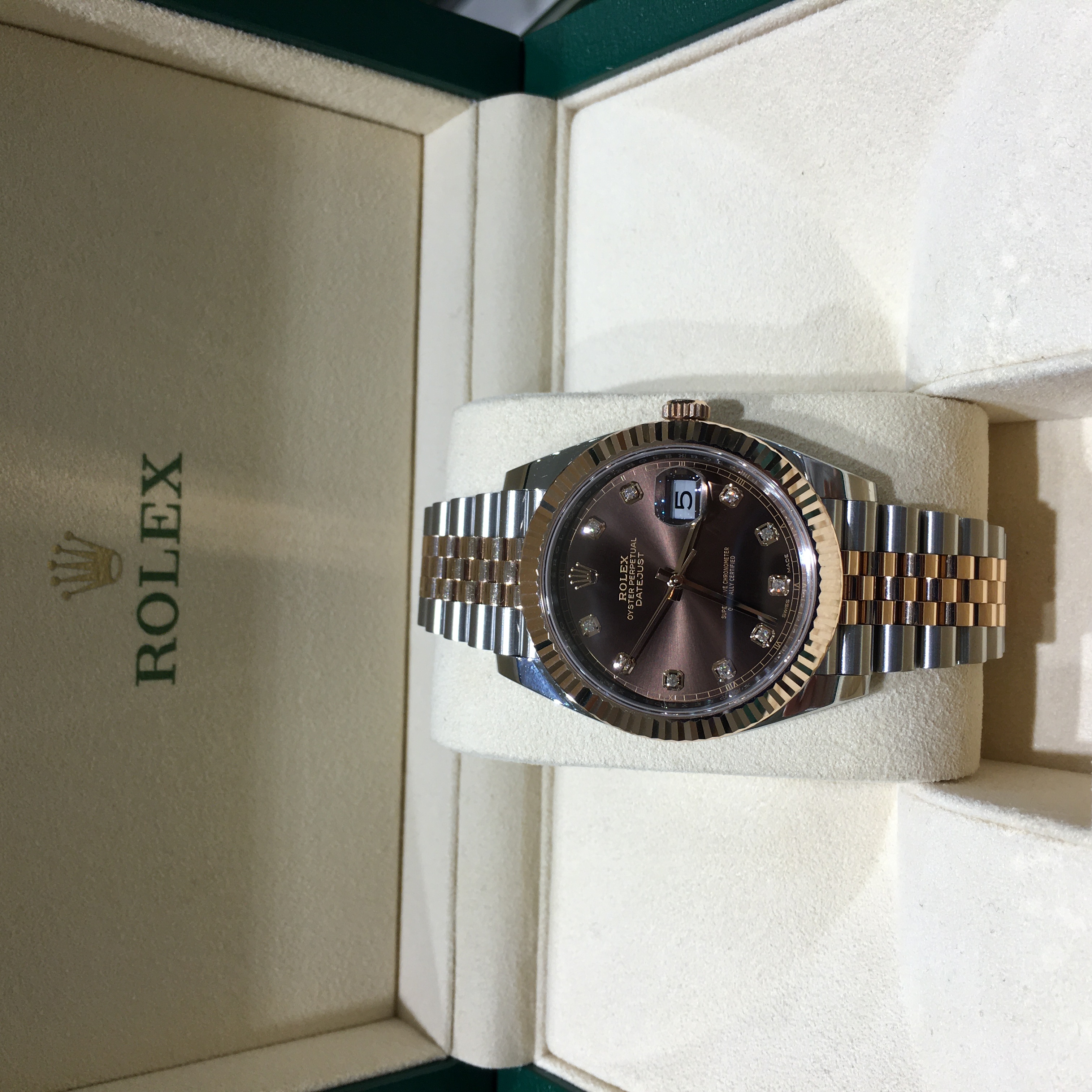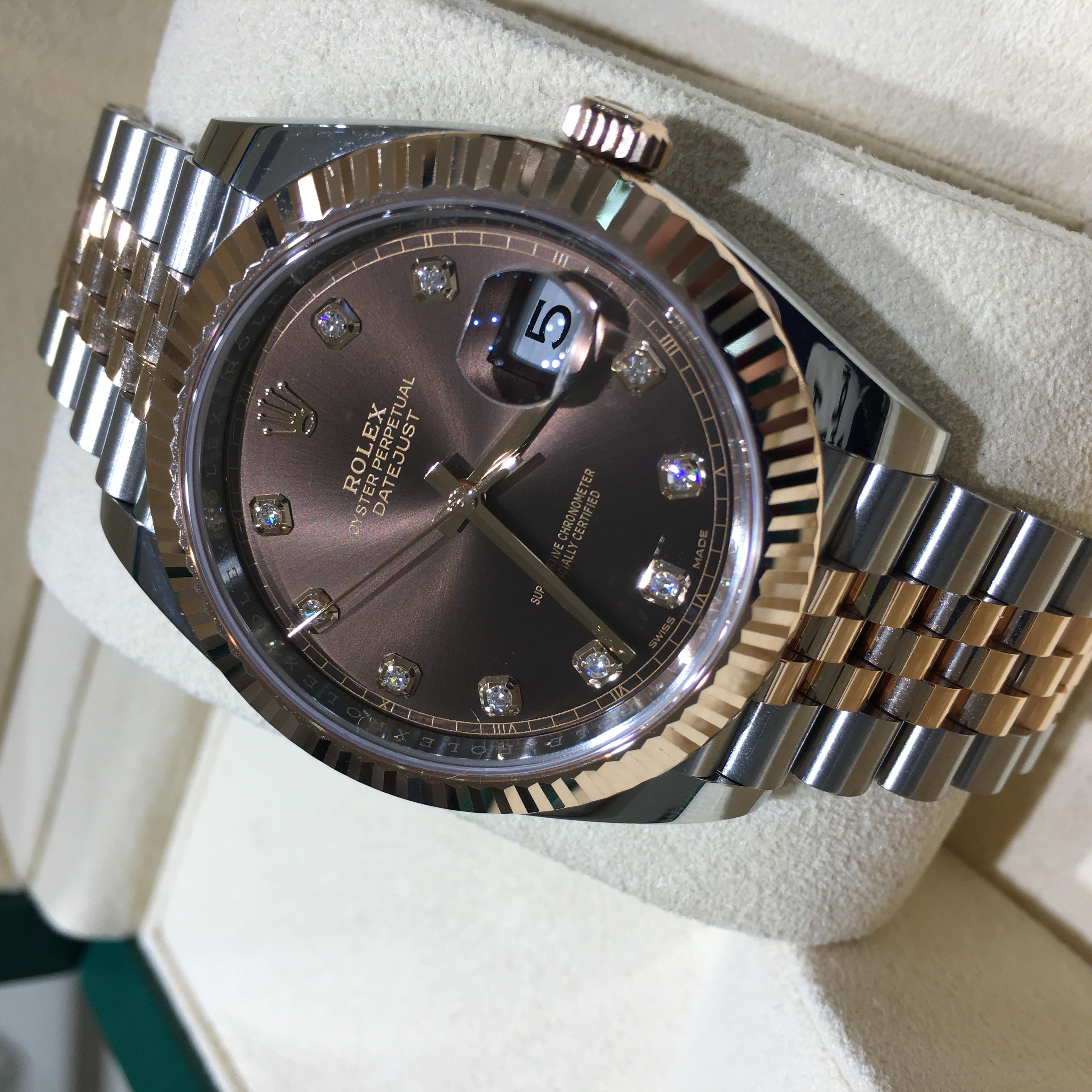 ロレックス独自のRG「エバーローズゴールド」と904Lスチールのコンビ”ロレゾールにチョコレートダイヤルに10Pダイヤをあしらったエレガントなモデルです。