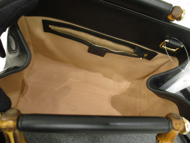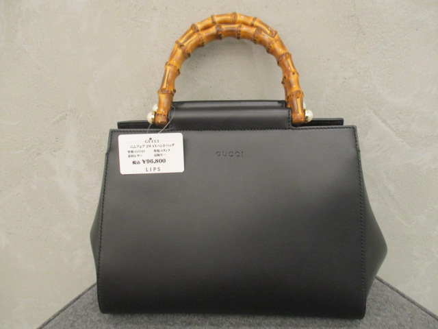 USED品。グッチの人気バンブーバッグです。レザー素材でお色はブラックですのでどんなファッションにも合わせやすく普段使いにもオススメです。