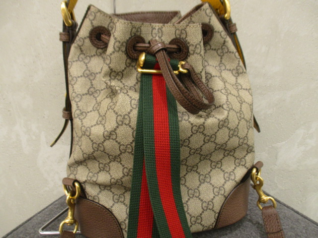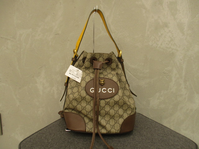 USED品。バケツ型のバックパック。トップハンドルと長さ調節可能のショルダーストラップで3通りのスタイルをお楽しみいただけます。底部に若干の傷と巾着の紐部分に使用感があります。