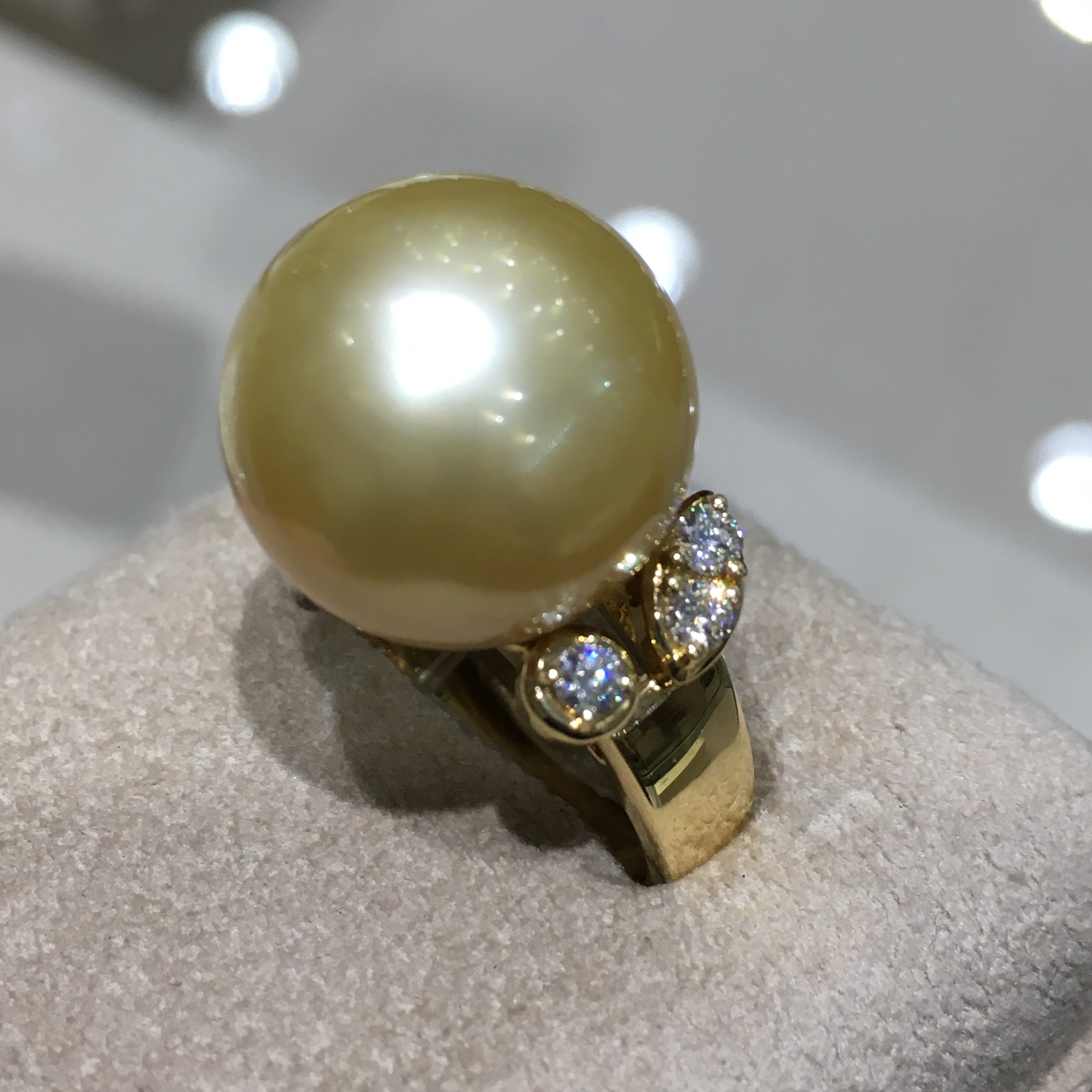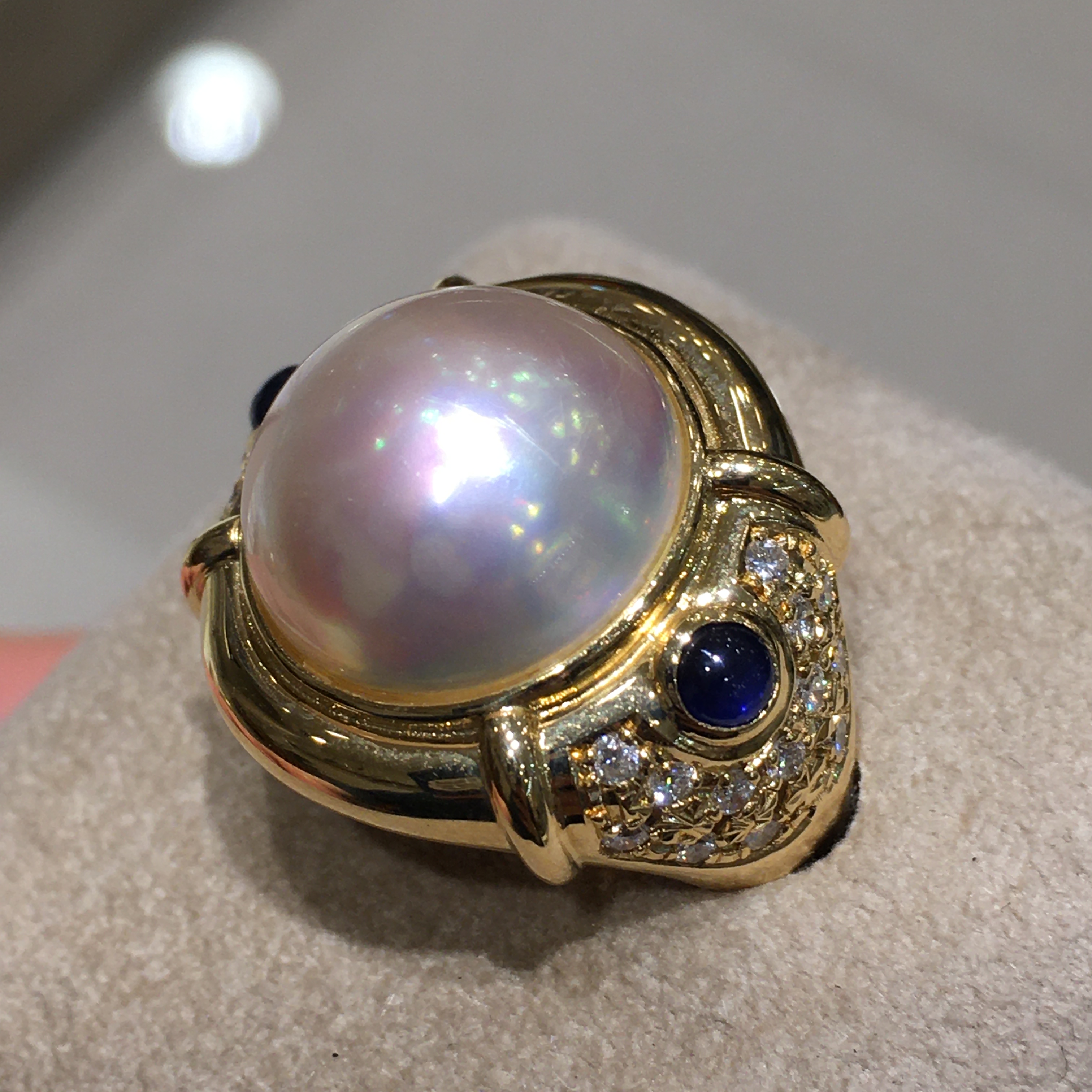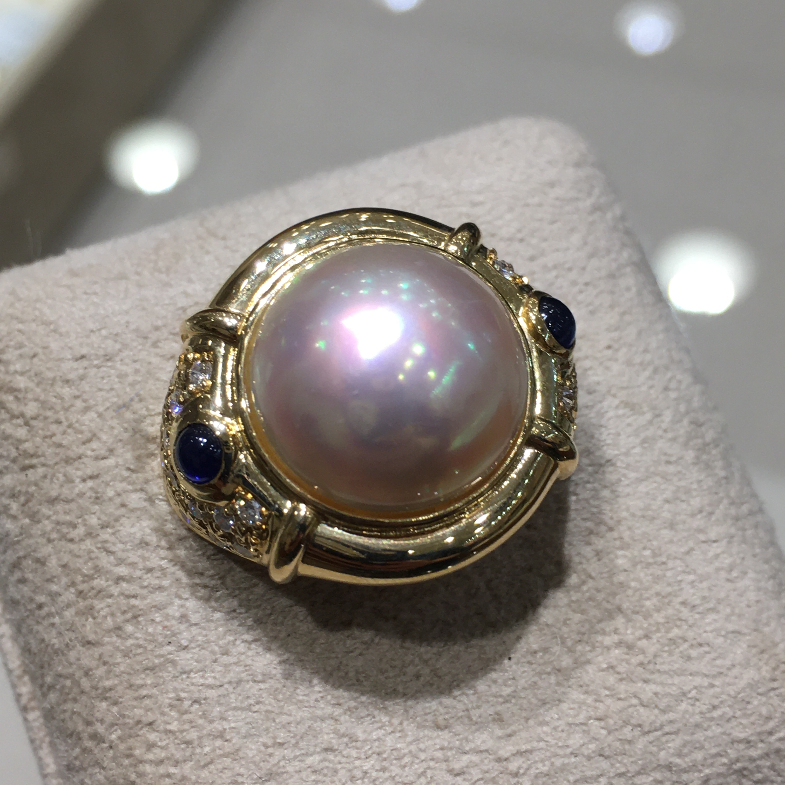 パールのサイドにダイヤモンドとサファイヤがセッティングされています。
