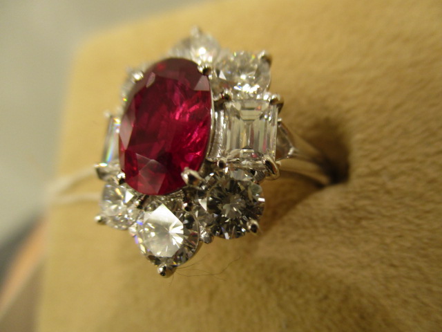 USED品。プラチナ製。7月の誕生石で、和名は「紅玉」。情熱・仁愛・威厳の意味があり、恋愛や仕事に前向きな力を与えてくれるといわれているルビーです。