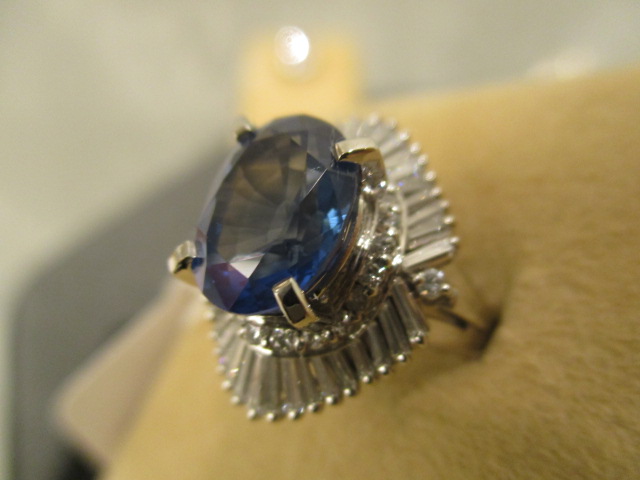 USED品。プラチナ製。9月の誕生石で、和名は「青玉」。誠実・慈愛・徳望の意味があり、自信がつき、成功を収めることができるといわれているサファイアです。