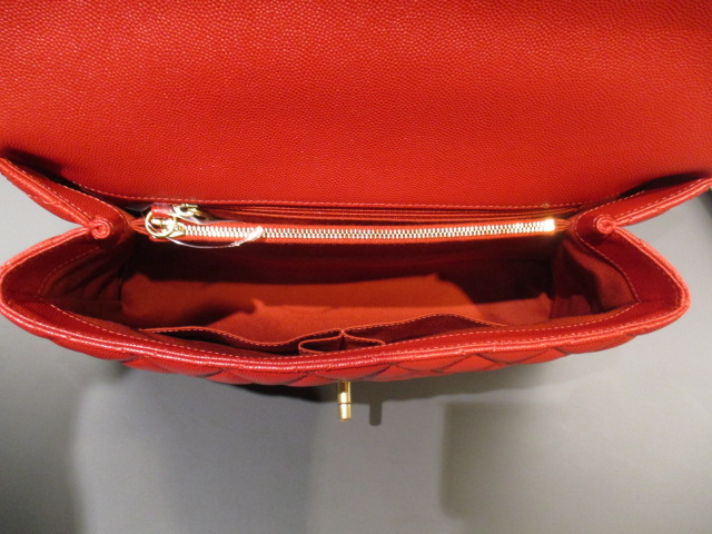 ボリューム感のある素材が高級感を演出し、シャネルの良い所がギュッと詰まったデザインです。単色のレッドがファッションの差し色になり、金具がゴールドで上品です。