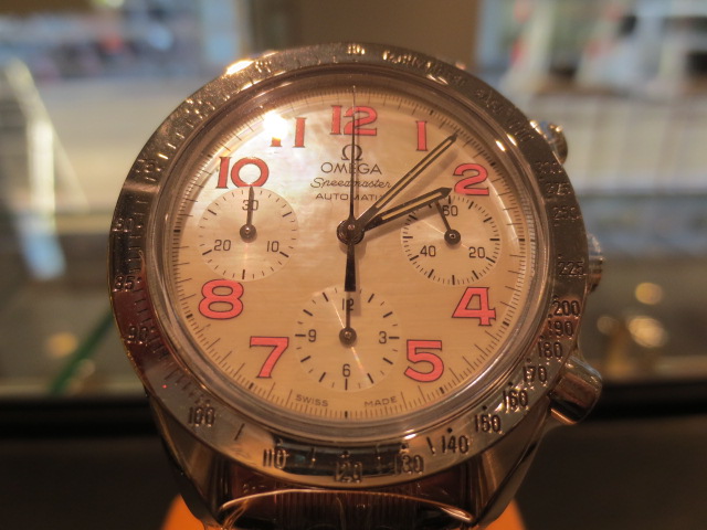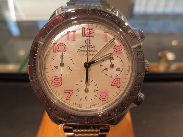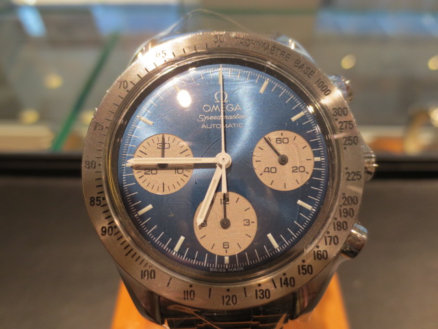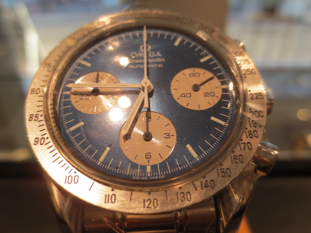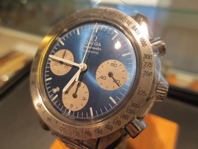 オメガの人気「スピードマスター」。クロノグラフ機能がついた便利な多機能ウォッチ。日本限定の2トーンダイヤルです。
