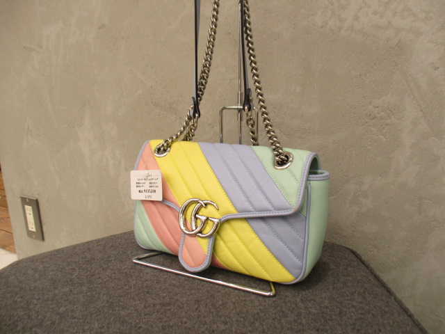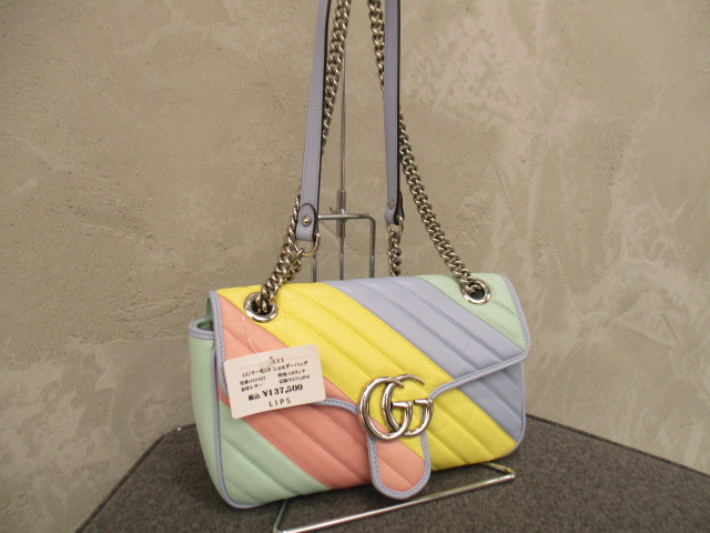 USED品。スモールサイズの「GGマーモント」チェーンショルダーバッグ。ややかっちりとしたフォルムとダブルGをあしらった大ぶりなフラップが特徴です。