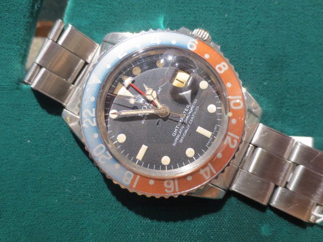 セカンドモデルになり、リューズガードが新たに備わった1675。ムーブメントはCal.1570に変わり振動数が18000振動から19800振動に上がっています。ダイアルは状態の良いマーク1ダイアルロングEで、「ROLEX」の「E」の真中が長いのが特徴です。マットダイアルの中では最も価値が高く、ブレスレットもヴィンテージブレスの中でも価値の高いエクステンションのUSリベットブレスという分かる人にしか分からない超レアな1本です。