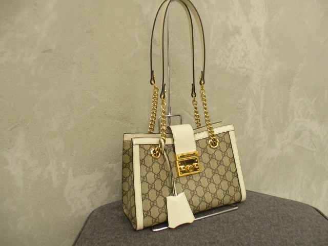 USED品。GGスプリーム キャンバスのストラクチャード ショルダーバッグ。ストラップと、アーカイブから復刻されたキーロック クロージャーが付いています。キーは取り外し可能なレザーのキーケースに収められています。
