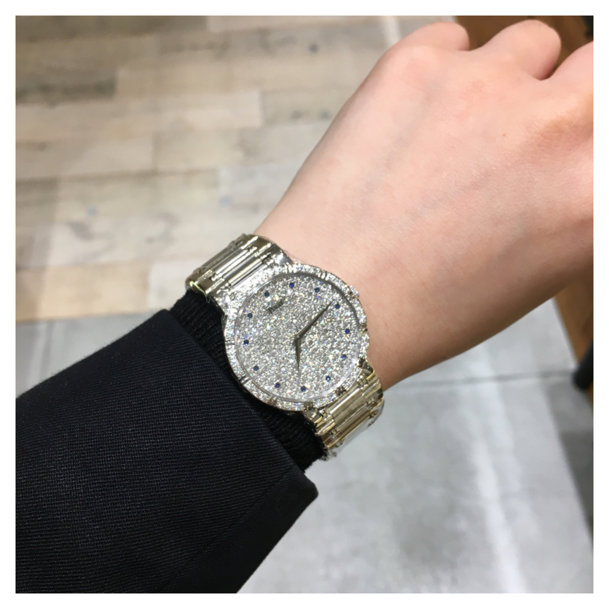 K18ホワイトゴールド製。ケース全体にダイヤモンドがセッティングされたラグジュアリーなデザインです。