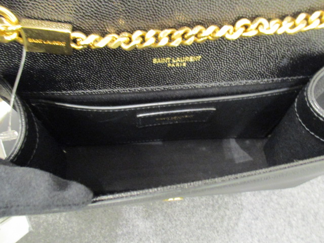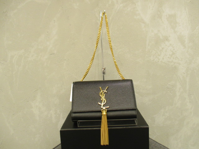 USED品。ゴールド金具。クラシカルなショルダーバッグ。イニシャルをかみ合わせたメタルのYSLロゴとメタルチェーンタッセルがお洒落なバッグです。
