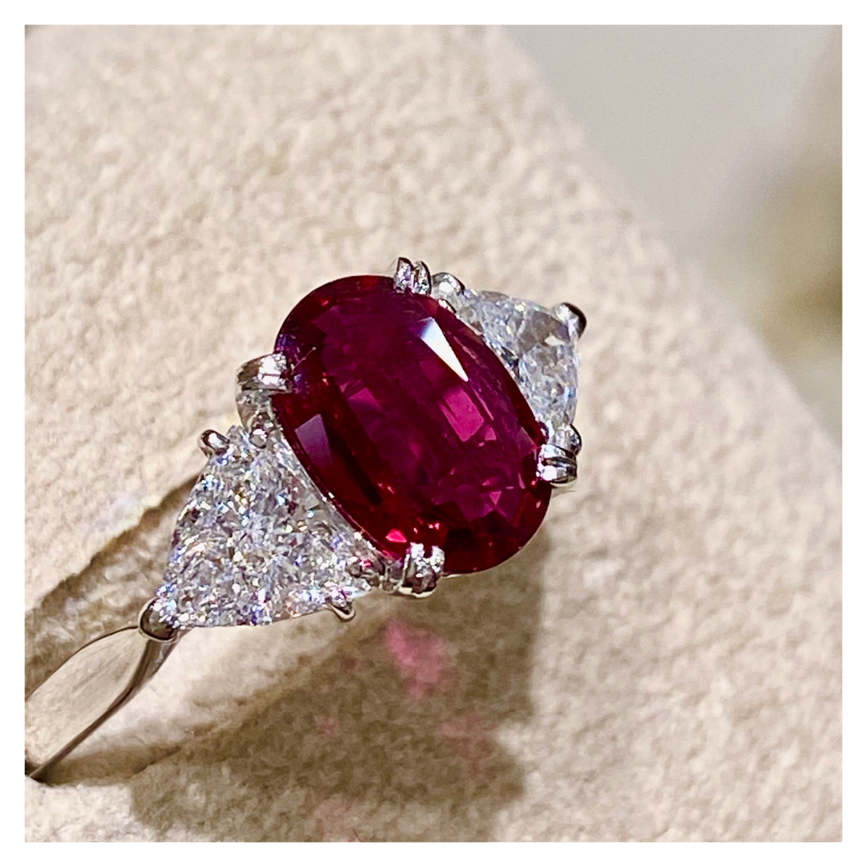 美しいルビーがセンターに配され、両サイドのダイヤモンドも、キラキラと輝いています。