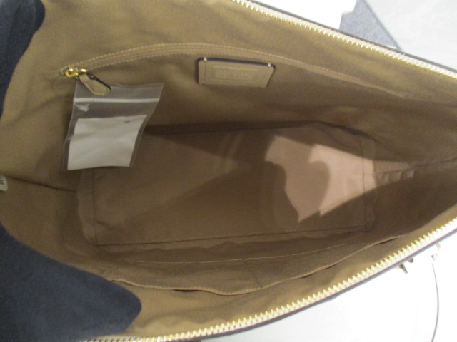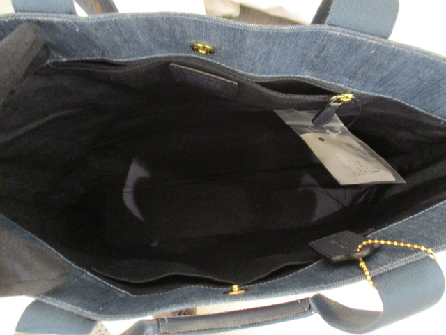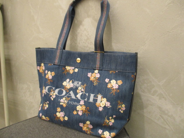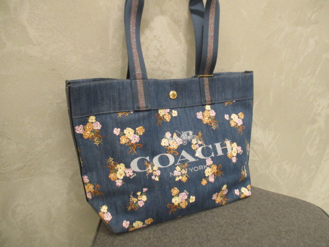 USED品。インディゴデニムのキャンバス地にラメ入りフローラルプリント(花柄)×ネイビーのレザー、フロントのコーチロゴ/トレードマークの馬車がオシャレなトートバッグです。間口はホックボタン開閉で、内側にもポケットがあり使い勝手の良い仕様となっています。