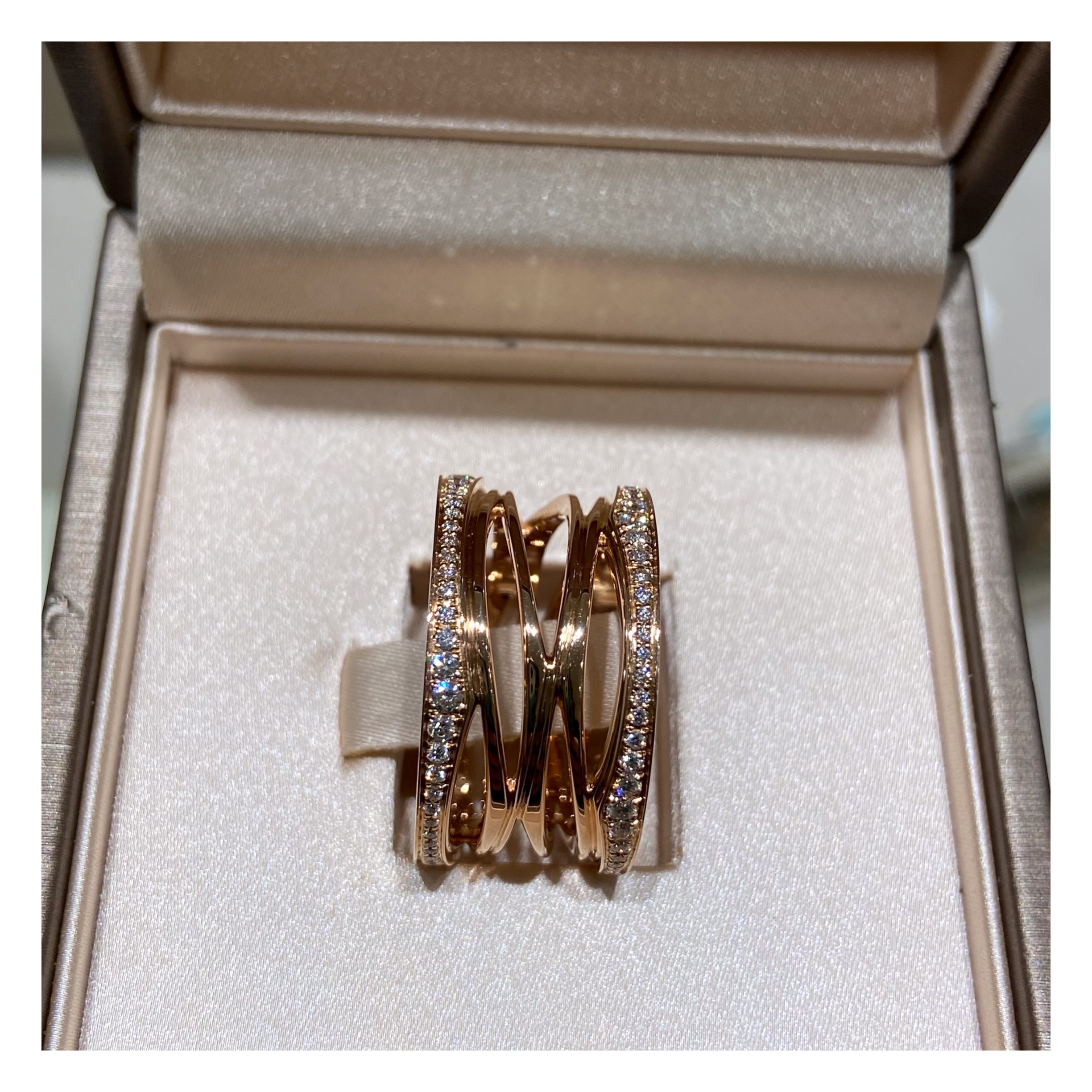 躍動感のある曲線がオリジナルのデザインと調和し、美しいバランスに仕上がっています。 こちらは、18金ピンクゴールドに0.61カラットのパヴェダイヤをあしらった4連タイプのリングです。