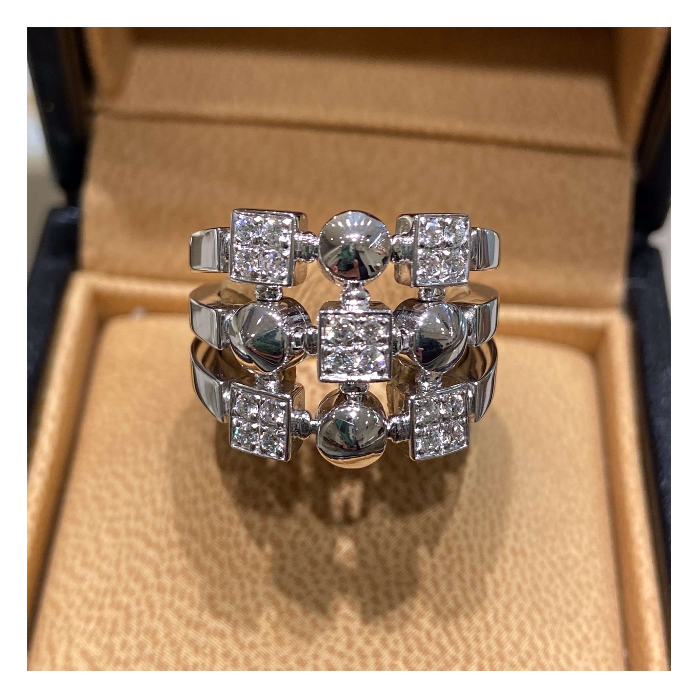 幾何学的な模様をデザインに組み込んだブルガリの遊び心が伺える、『ルチア』コレクション 3連に豪華なデザインの施された正面部分には、パヴェセッティングのダイヤモンドが上品な煌きを放ちます。