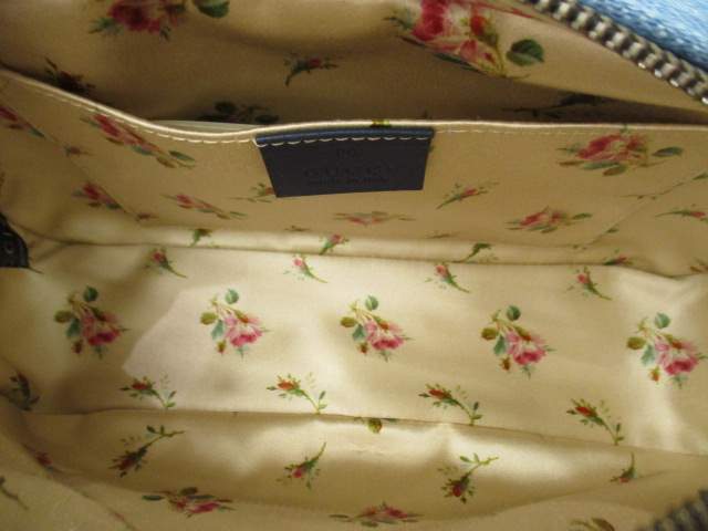 USED品。さわやかなデニム生地にゴールドのチェーンストラップを合わせたショルダーバックです。裏地は小花柄となっており可愛らしいデザインです。