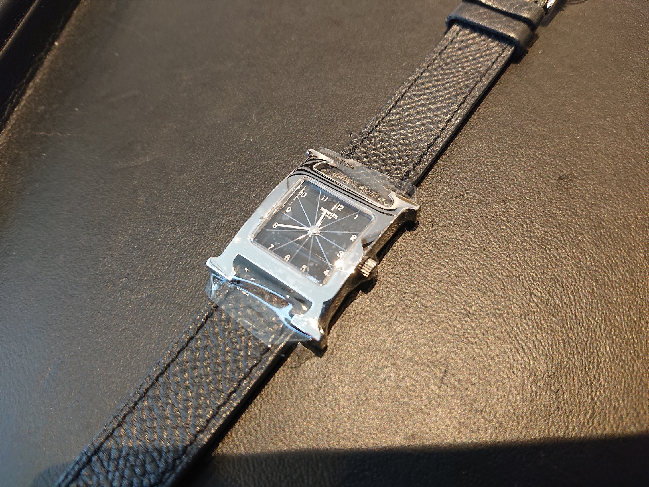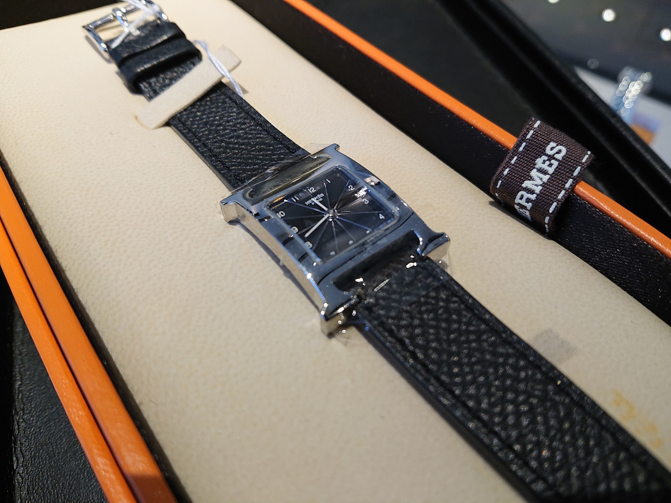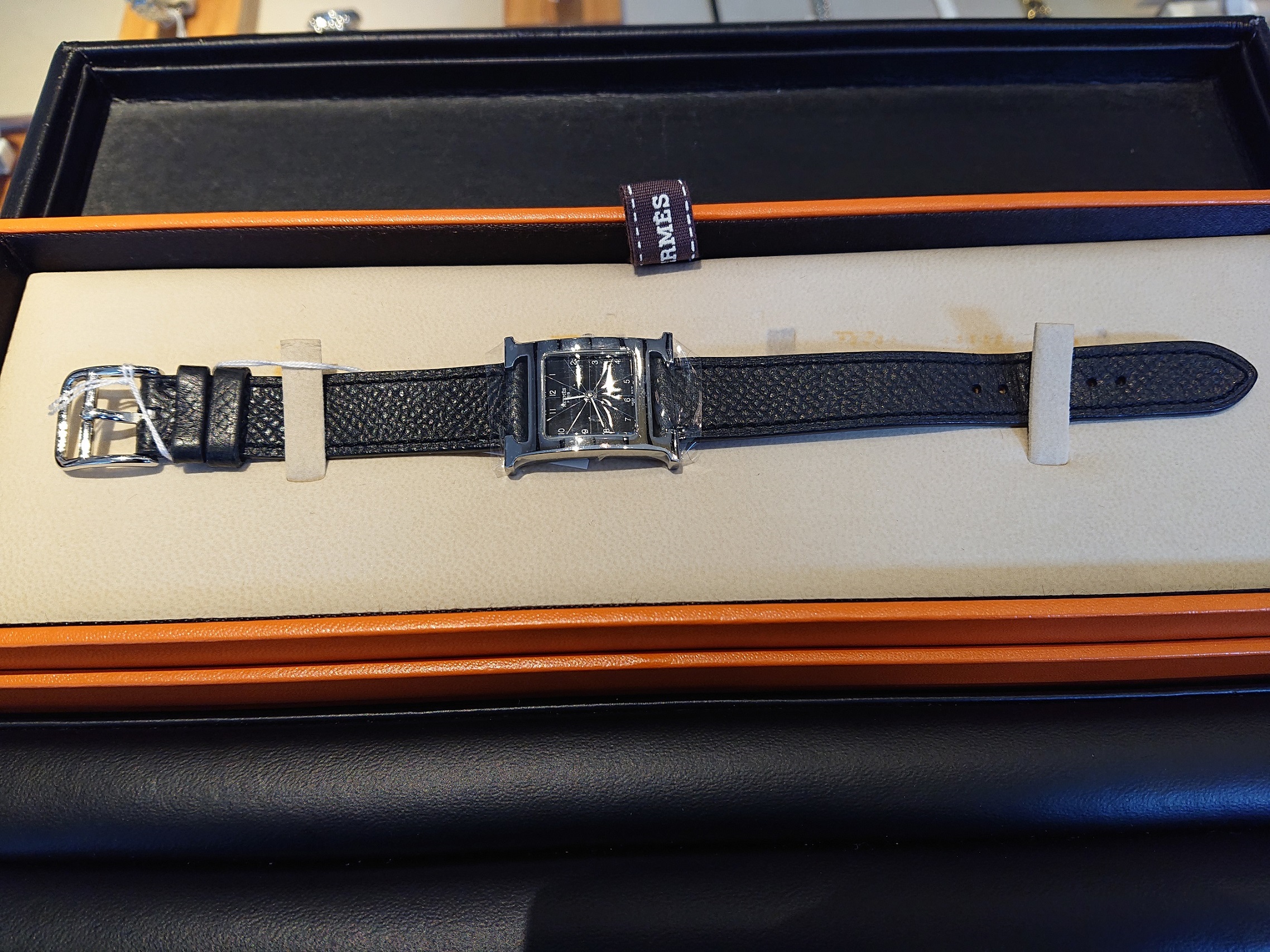 「H」をモチーフにしたモデルでこちらも人気があります。黒文字盤にブラックレザーベルトの組み合わせなのでシックな印象です。箱と保証書も付属しております!