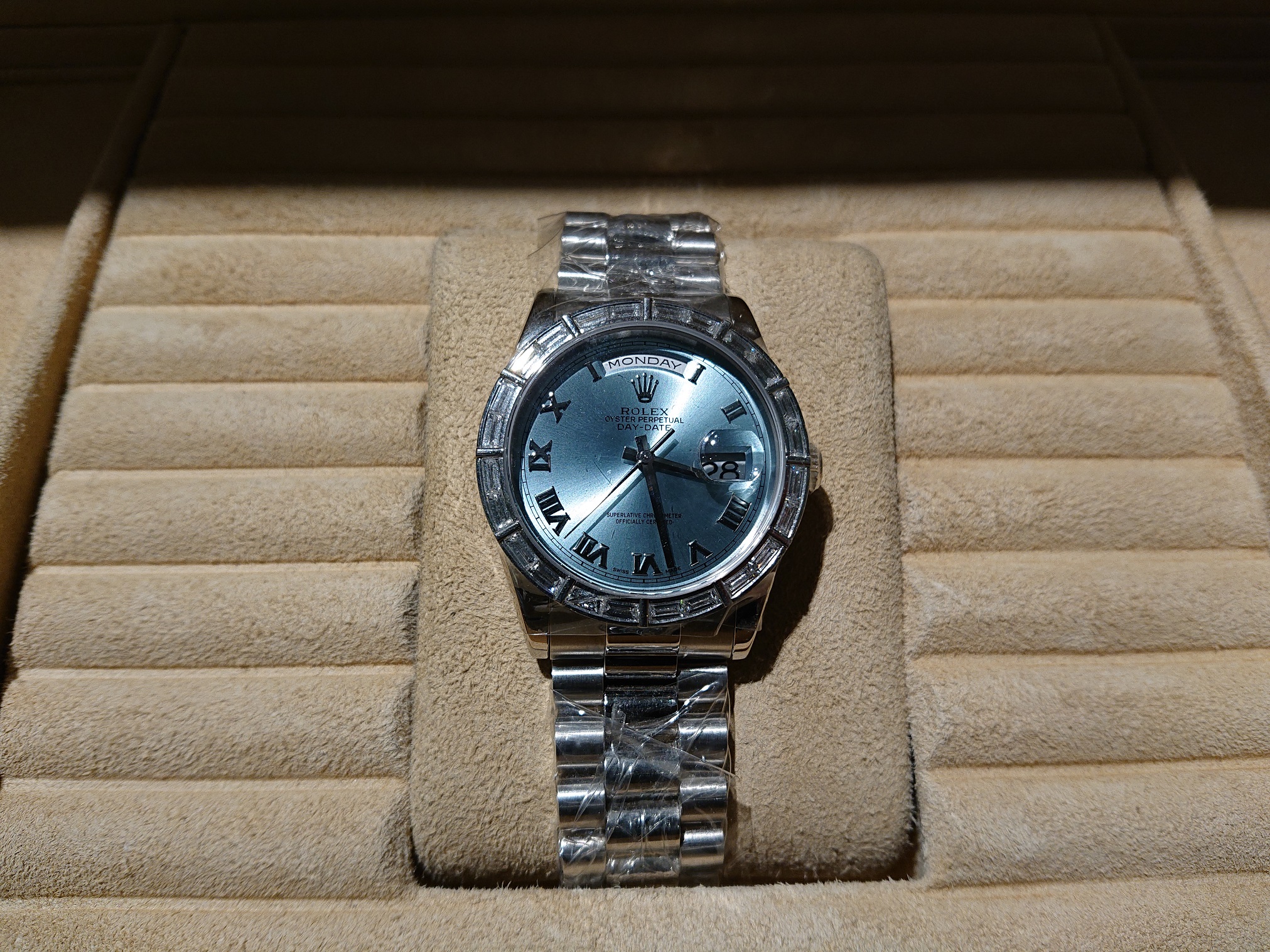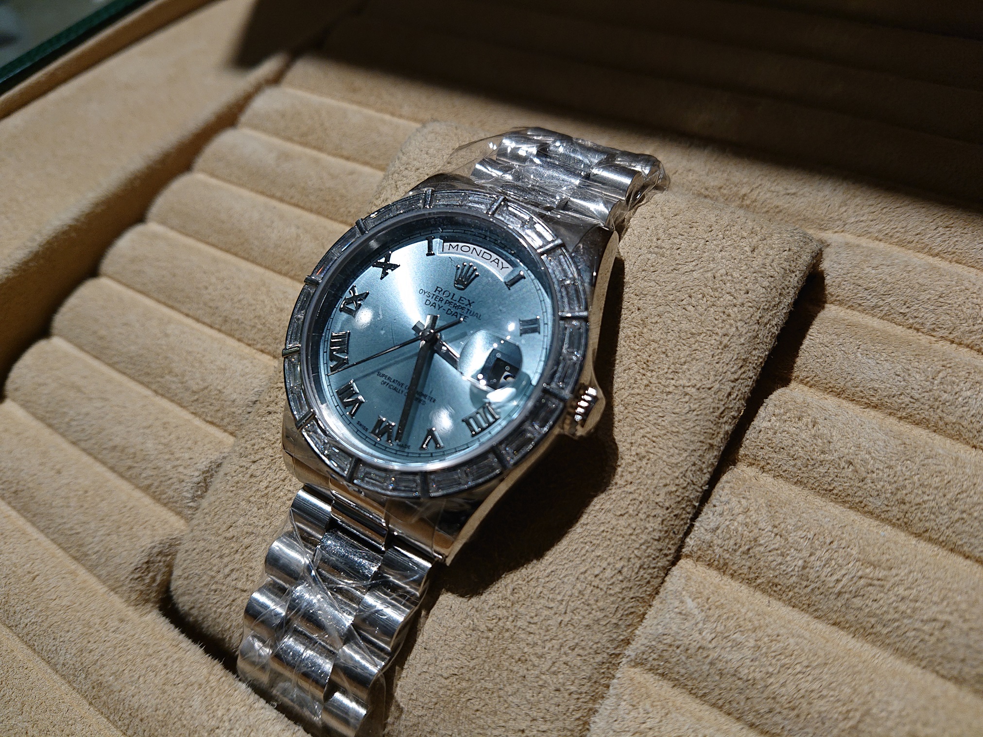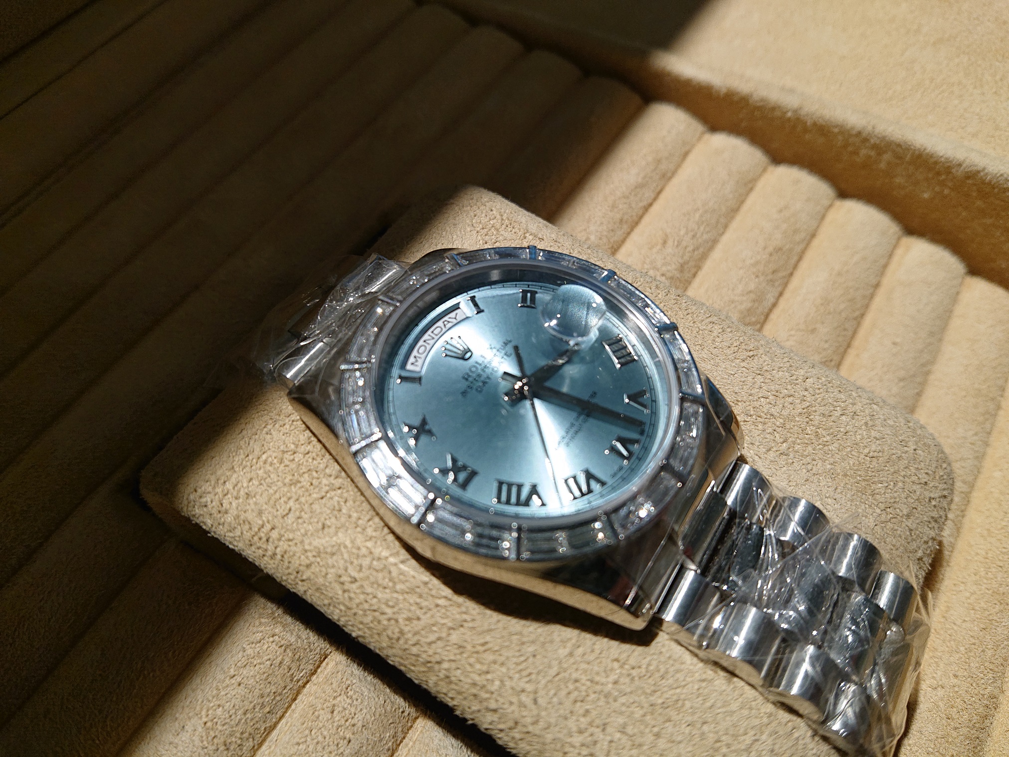 こちらはプラチナのデイデイトになります。ベゼルがバケットダイヤとなっており、文字盤は人気のアイスブルーです。