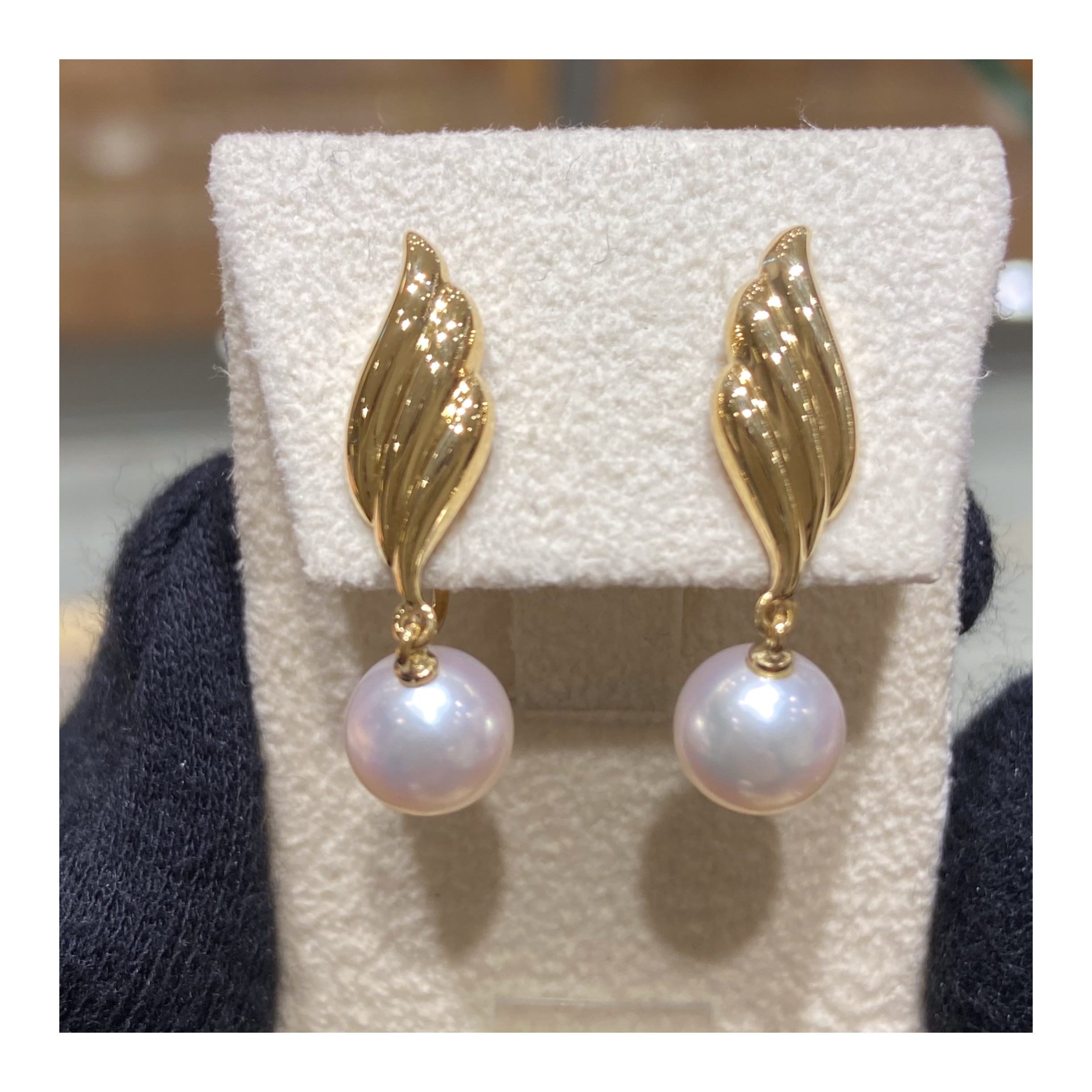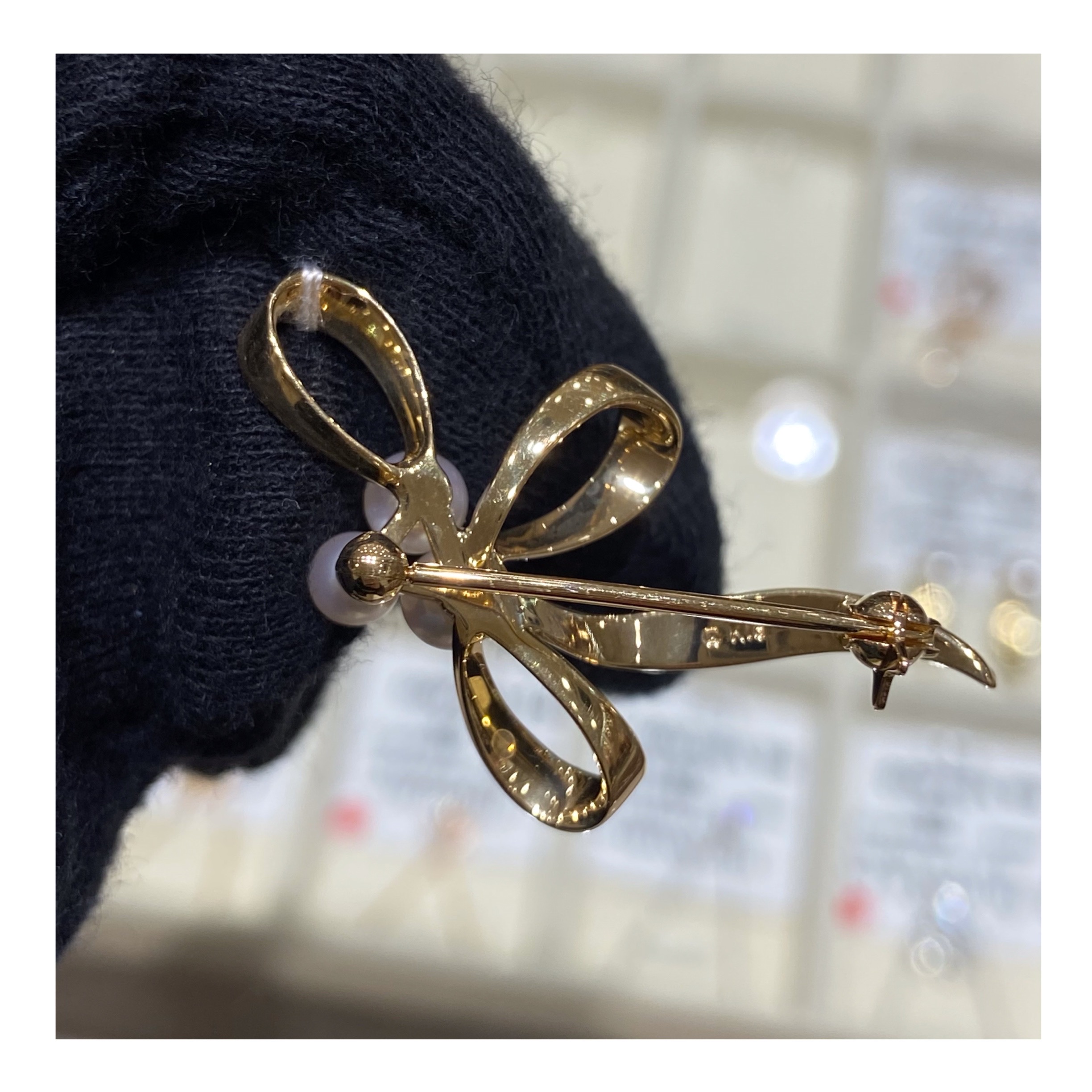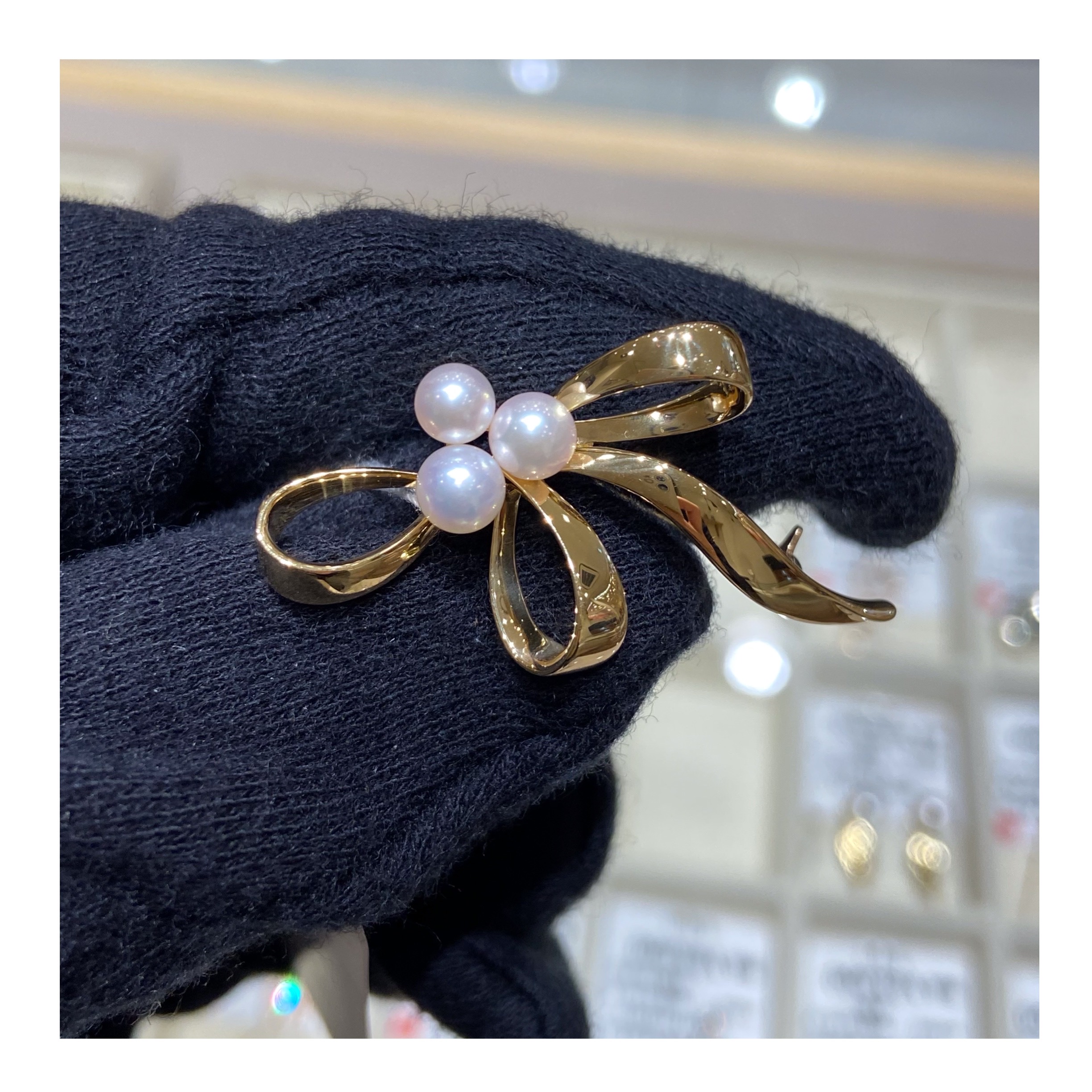リボンのようなモチーフに3粒のあこや真珠を添えた、テリが良く高品質なパールを引き立てる、シンプルで立体感のあるブローチです。