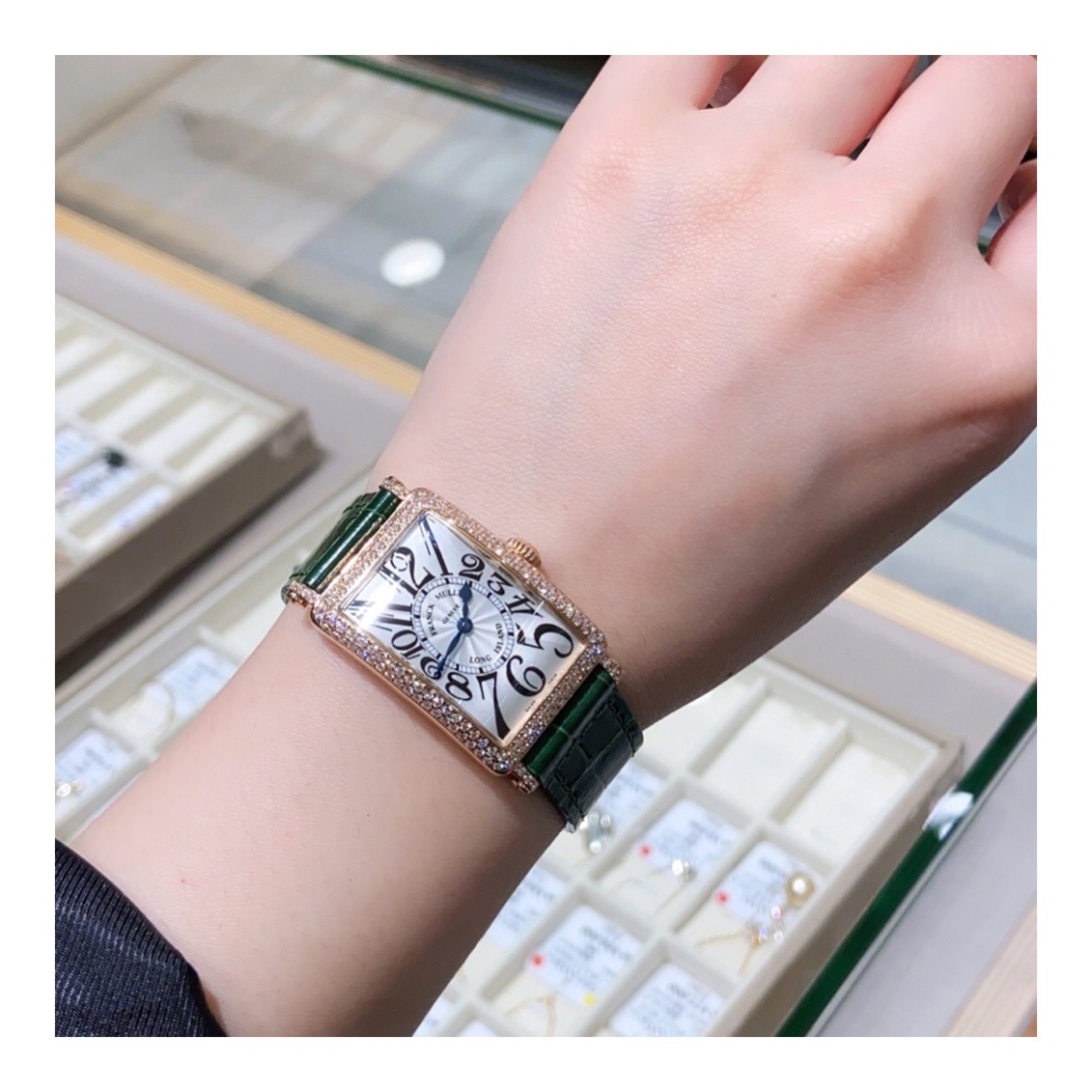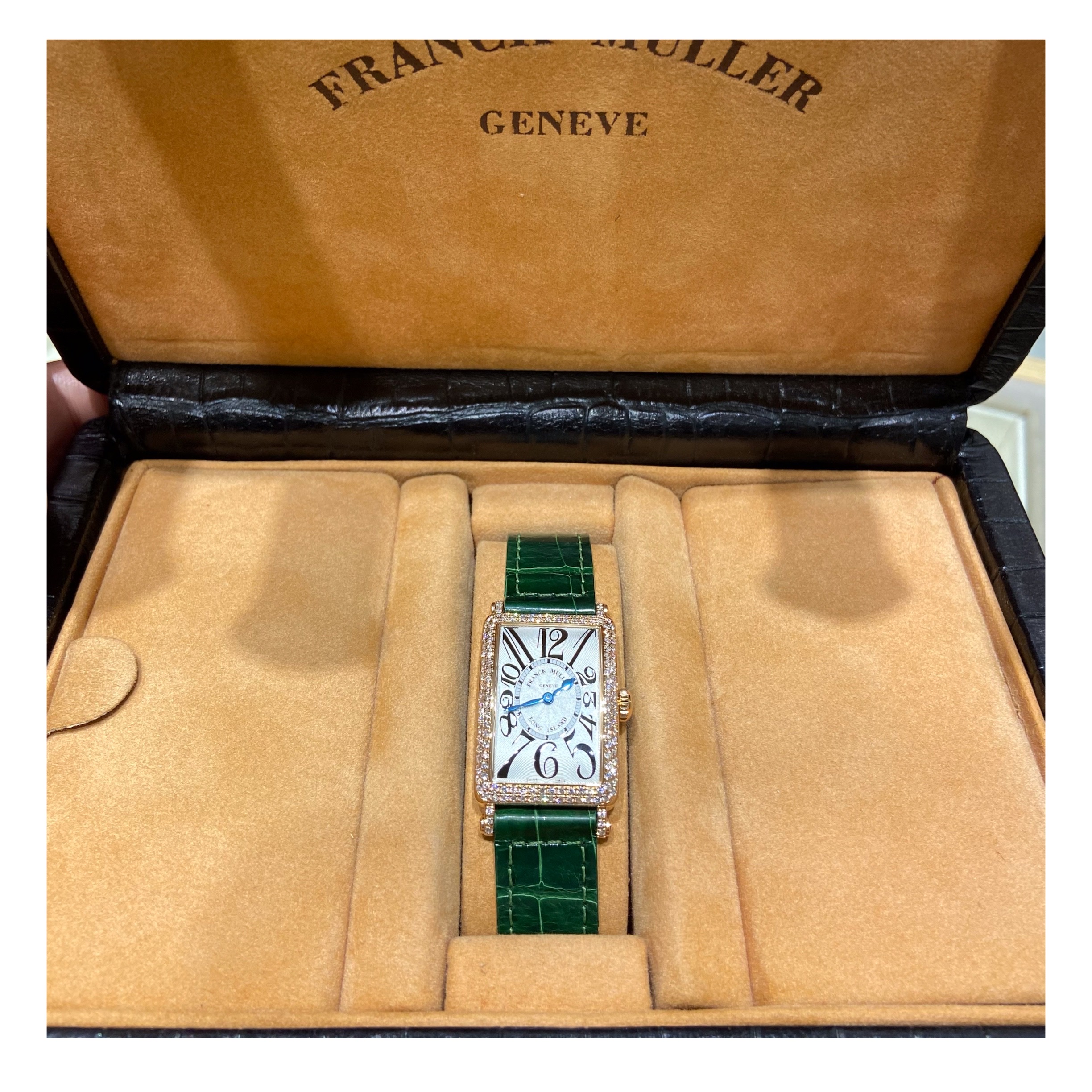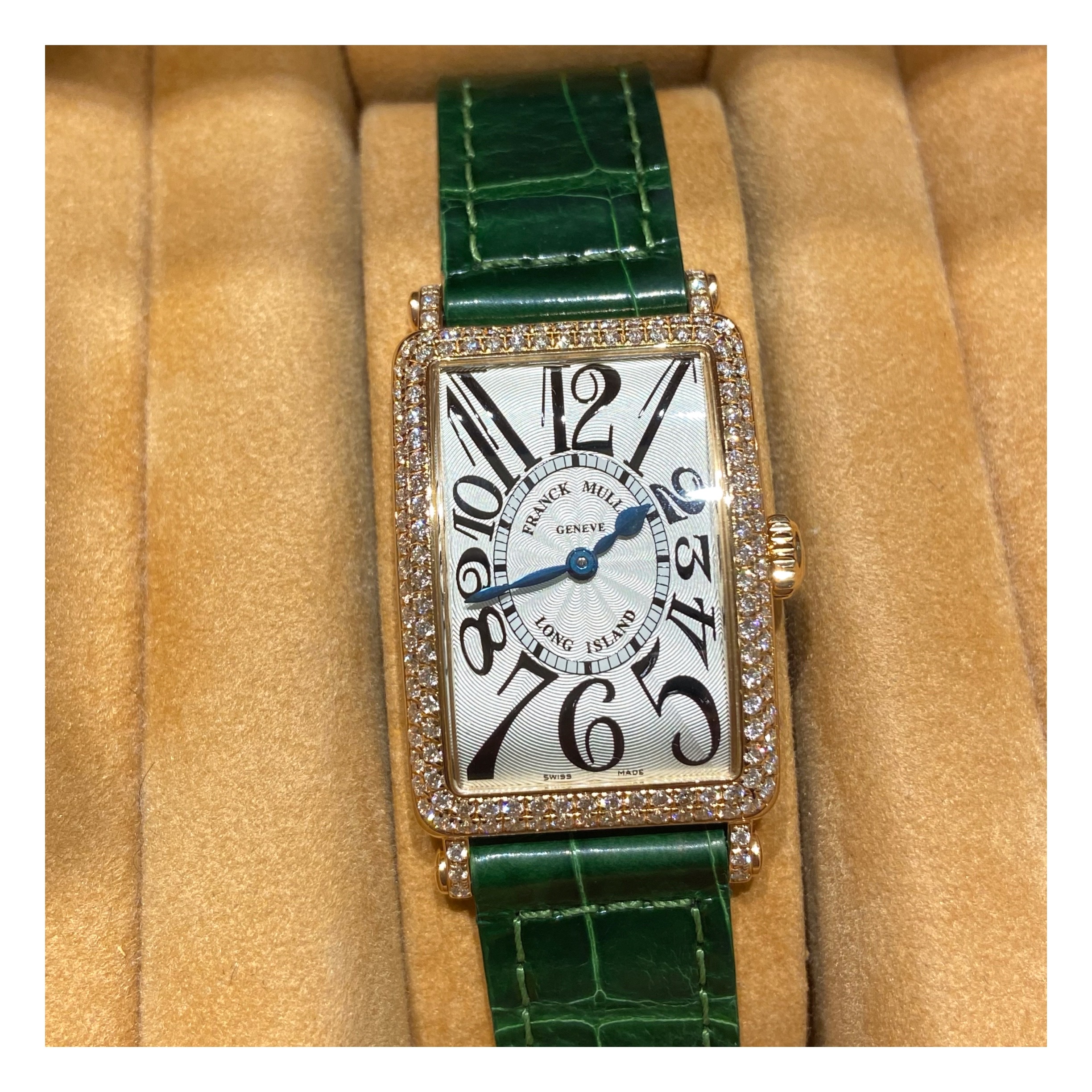 フランクミュラーの中でも特に人気のある「ロングアイランド」。こちらはケース、ラグにダイヤモンドを施した豪華なモデル。ピンクゴールドとの色合いが美しい一本です。