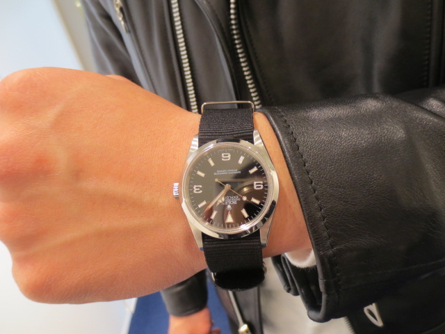 とてもカッコいいエクスプローラー1です。NATOベルトのブラックも一緒に買って頂きこちらに交換しました☆いやぁ~、カッコいいですね!!!ご来店された時のファッションにとてもマッチしていてすごく素敵でした!!僕もエクスプローラー1が欲しくなってしまいました(笑)NATOベルトに合わせるのもすごく良いですね☆