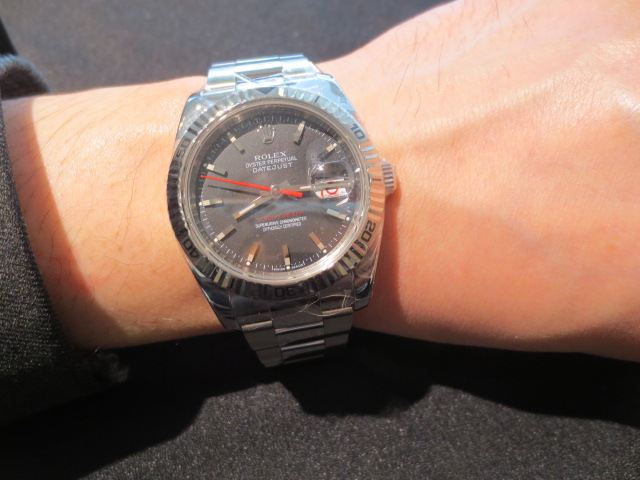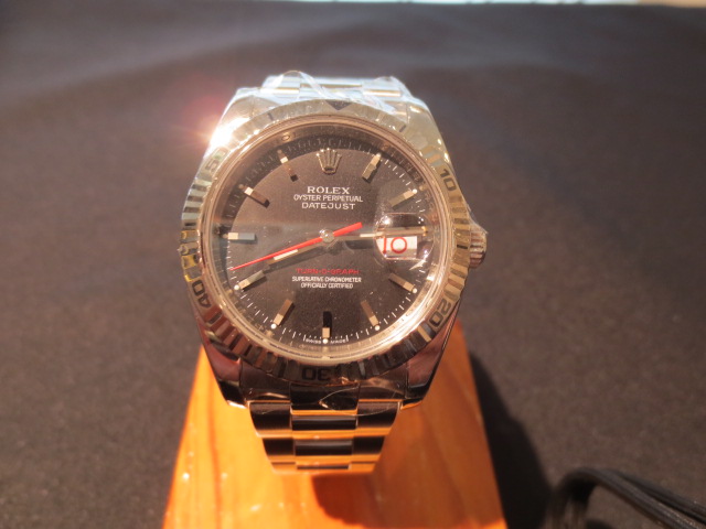 デイトジャストですのでドレス系ではありますが、とてもスポーティーに見えると思います。赤い針が個性的でとてもオシャレですね!スーツにもカジュアルにも合わせやすい時計だと思いますのでオススメです!!