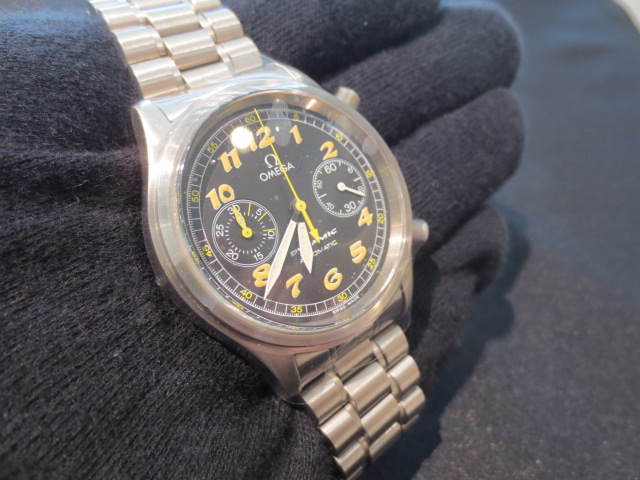 今、世界の時計好きやオメガ・ファンから大変注目されている時計です。NATOベルトや革バンドへチェンジして個性をさらに出したり、自分だけのオリジナル・ウォッチにするのが流行っているようです。もちろんこの時計は、このままでも非常にカッコイイ時計です☆弊店にも革バンドやNATOベルトは豊富にありますので、ご来店時にはぜひご覧ください!