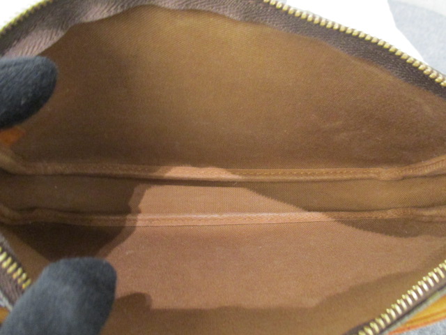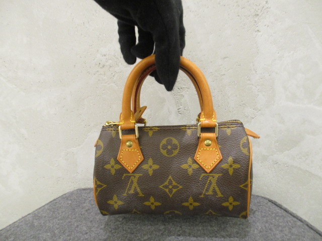 USED品。コンパクトサイズで人気のミニスピーディ。小物や化粧品入れなどにピッタリ。ポーチ感覚でも使用できるバッグです。ヌメ革は適度に色焼けしております。トワル地全体的に白い汚れがあります。