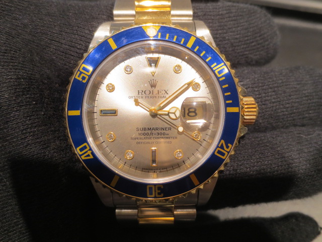 ロレックスの中でも特に人気度の高い「サブマリーナ・デイト」のイエローゴールドとステンレスのコンビモデルで文字盤に8Pダイヤ・3Pサファイアが施された高級感溢れる1本。人気のグレー文字盤で保証書付でコンディションが良いものは数が少ないのでコレクター商品としてもオススメです。