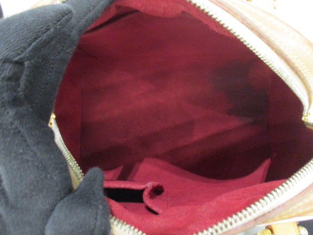 USED品。廃盤品。小ぶりなサイズですが高さが有り、マチもあるためお出かけの際には大活躍間違いなしです。多少使用感有。内部底に大きなシミがあります。ヌメ革全体に色焼けがありハンドルとファスナー周辺に黒ずみがあります。マルチカラーの白地も全体的に黒ずみがあります。