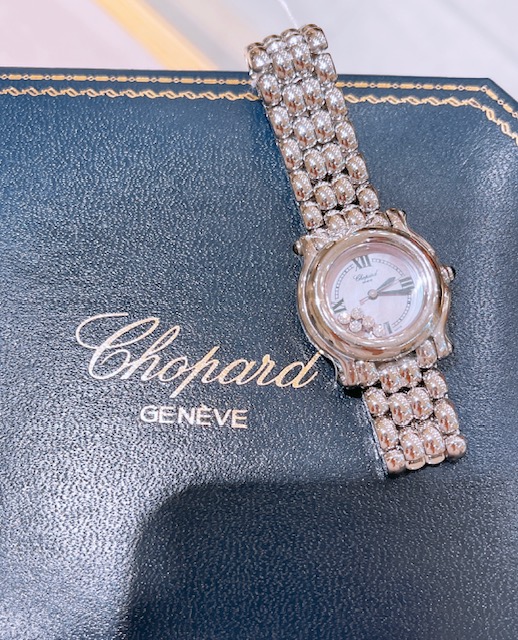 女性の憧れの人気ブランド「ショパール」。白文字盤の上をクルクルと動き回るダイヤが特徴的なハッピースポーツ。上品ながらも遊び心を取り入れた人気モデル。