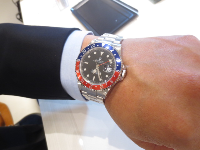 お買い上げ頂いたのは1999年製の極美品であるGMTマスター2です!!今流行のペプシ・ベゼル(青赤)が時計に付いていますが、付属品として、ロレックスの純正交換用ベゼルが2種類付いています。2種類のベゼルは、コーク(黒赤)とブラックで非常にコレクション性の高い物です。お客様に非常に気に入ってくださいまして、私自身もこの時計をご案内出来てとても嬉しいです。永くご愛用頂ければ幸いでございます。お買い上げありがとうございました!!