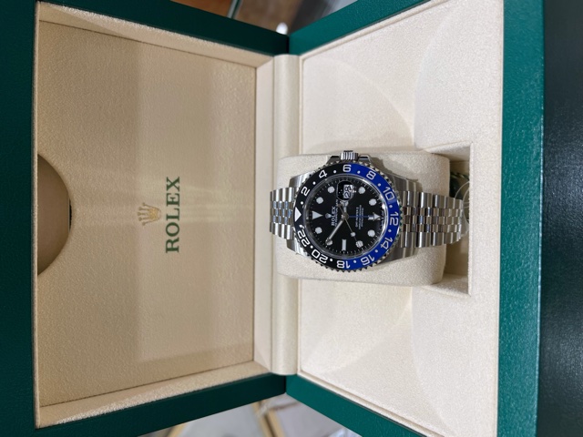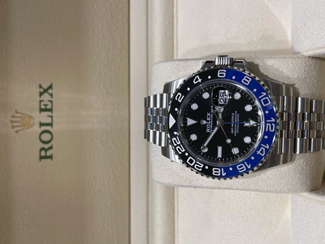 ロレックスの人気モデル「GMTマスター2」。ベゼルが新色のブルーとブラックの「2色のセラクロムベゼル」が装備され、24時間表示針もブルーになりました。そのブルーは、明度を抑えてあるため、知的で落ち着いた印象を受けます。