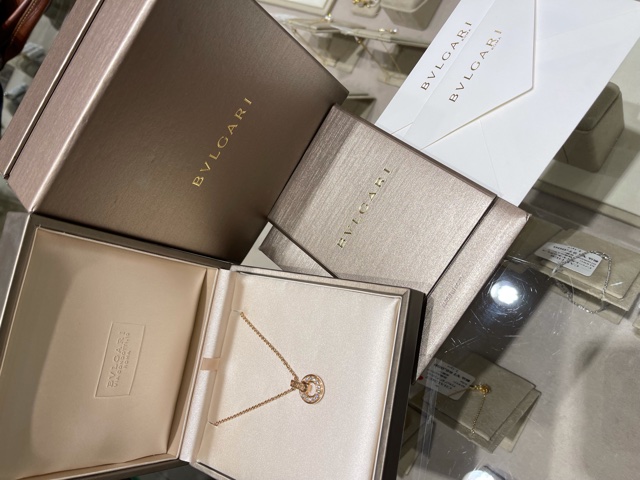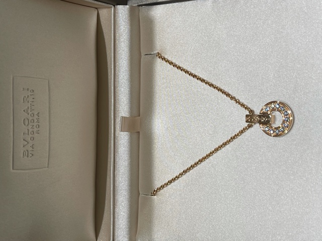 USED品。ピンクゴールド製。ブルガリ・ブルガリのネックレスは、古代のコインに施された曲線的な文字からインスピレーションを得て誕生しました。今日このロゴは遊び心のある意外な進化を遂げ、特徴的なデザインエレメントを構成しています。
