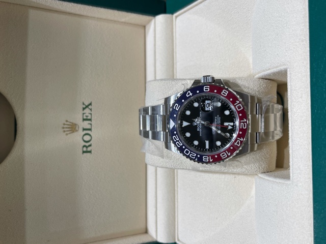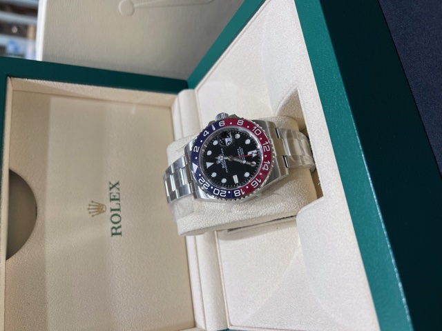 ロレックス人気モデル「GMTマスター2」です。セラミックベゼルにブレスやバックルも高級感が更に増した1本です。2021年発売のオイスターブレス仕様モデルです。